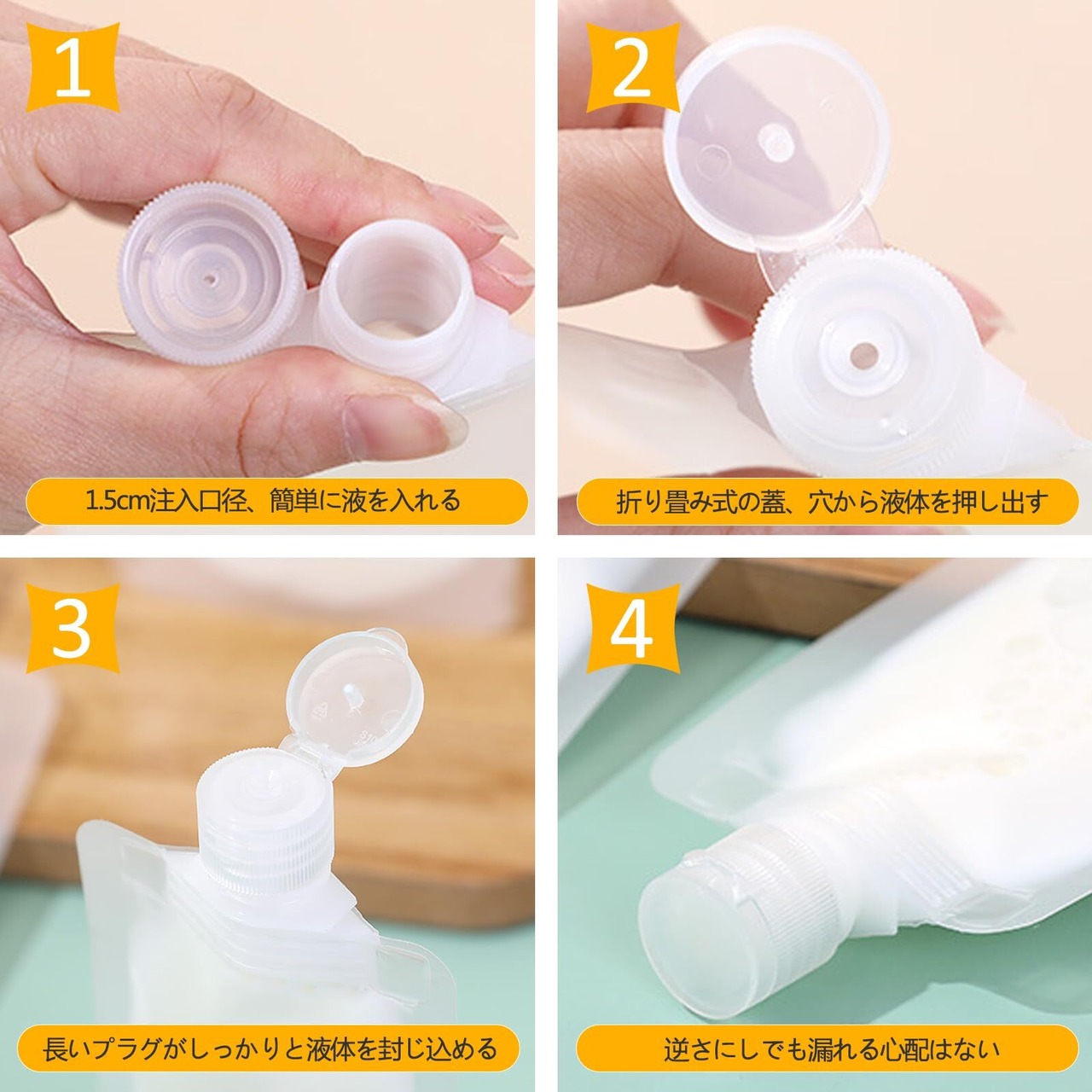 【使用簡単・液漏れ防止】トラベル液体個包装の注入口径が1.5cmというのは、液体を簡単に入れるための設計です。蓋をひねることで、その際に液体を入れることができます。また、使用時には折り畳み式の蓋を開けることで、小さな穴から必要な量の液体を押し出すことができます。蓋の長いプラグがしっかりと液体を封じ込めるため、漏れる心配はありません。