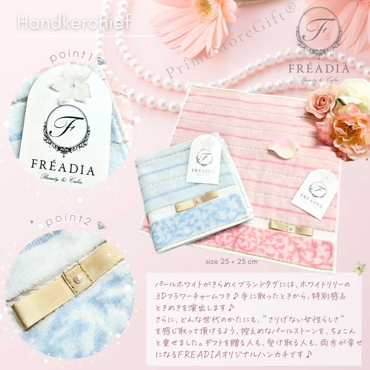 ️【FREADIAハンカチのこだわりポイント】パールホワイトがきらめくブランドタグには、ホワイトリリーの 3Dフラワーチャームつき手に取ったときから、特別感& ときめきを演出します さらに、どんな世代のかたにも、”さりげない女性らしさ” を感じ取って頂けるよう、控えめなパールストーンを、ちょこん と乗せました。ギフトを贈る人も、受け取る人も、両方が幸せ になるFREADIAオリジナルハンカチです