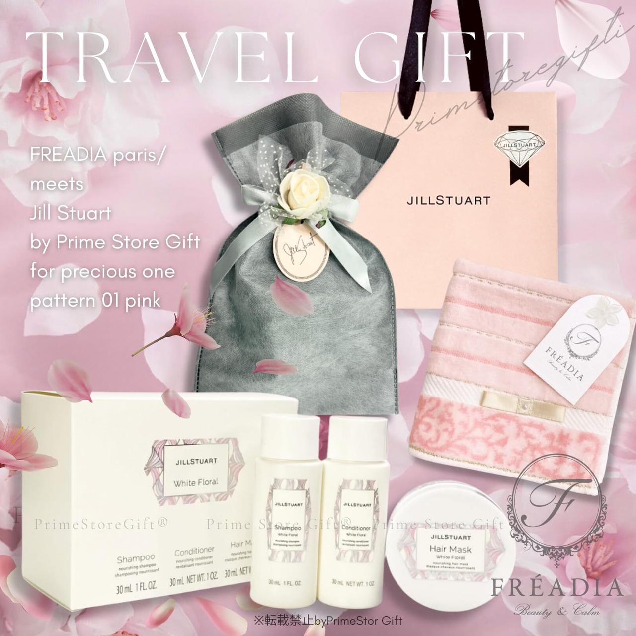 【セット品・ラッピング済み】JILL STUART ジルスチュアート ホワイトフローラル ヘアケア トラベルセット(シャンプー & コンディショナー& ヘアマスク)トラベルキット & FREADIA ハンカチ 母の日 ギフト 化粧品 誕生日 プレゼント ショッパー付き(ピンク)