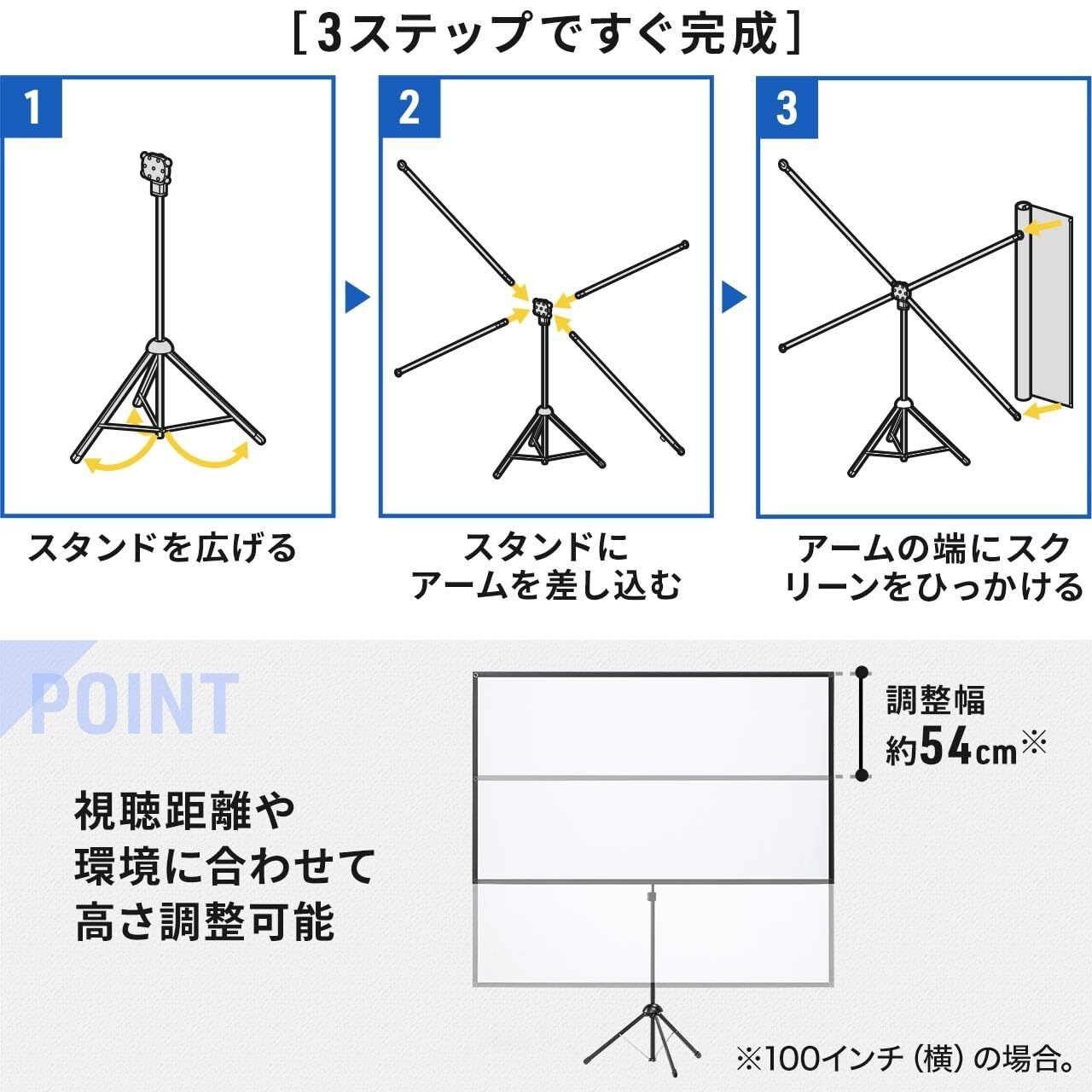 スタンド にアームを挿して スクリーン を取り付けるだけの組み立てのため、工具を使用しない 簡単 組み立て設計になっています。