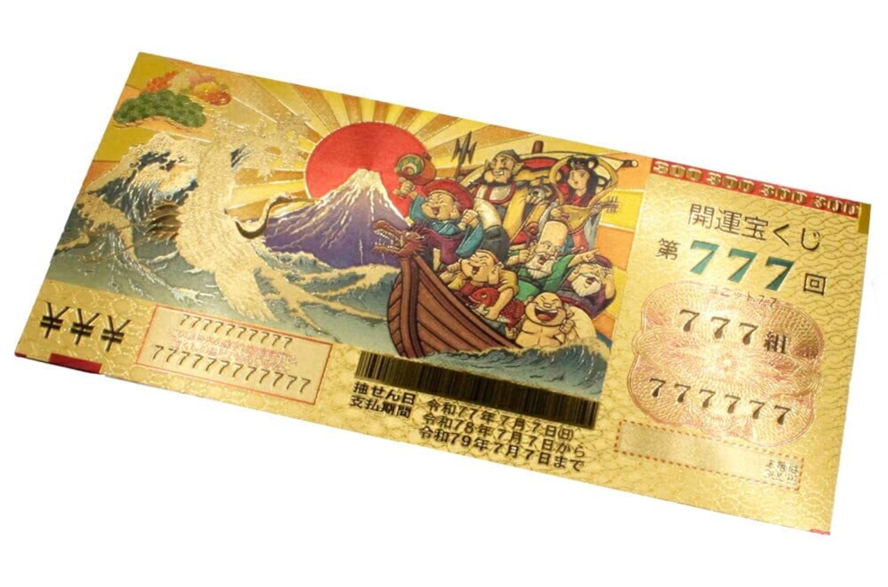 金の宝くじとは・・・金運を呼ぶ実物サイズの金の宝くじです。 この宝くじはプラスチックに表面アルミ・エッジング加工を施してあり豪華に輝いています お財布や宝くじ入れ、金庫に入れて金運を上げるお守りとして、また観賞用としてお使いください。 縁起物としてプレゼントにも大変喜ばれます。