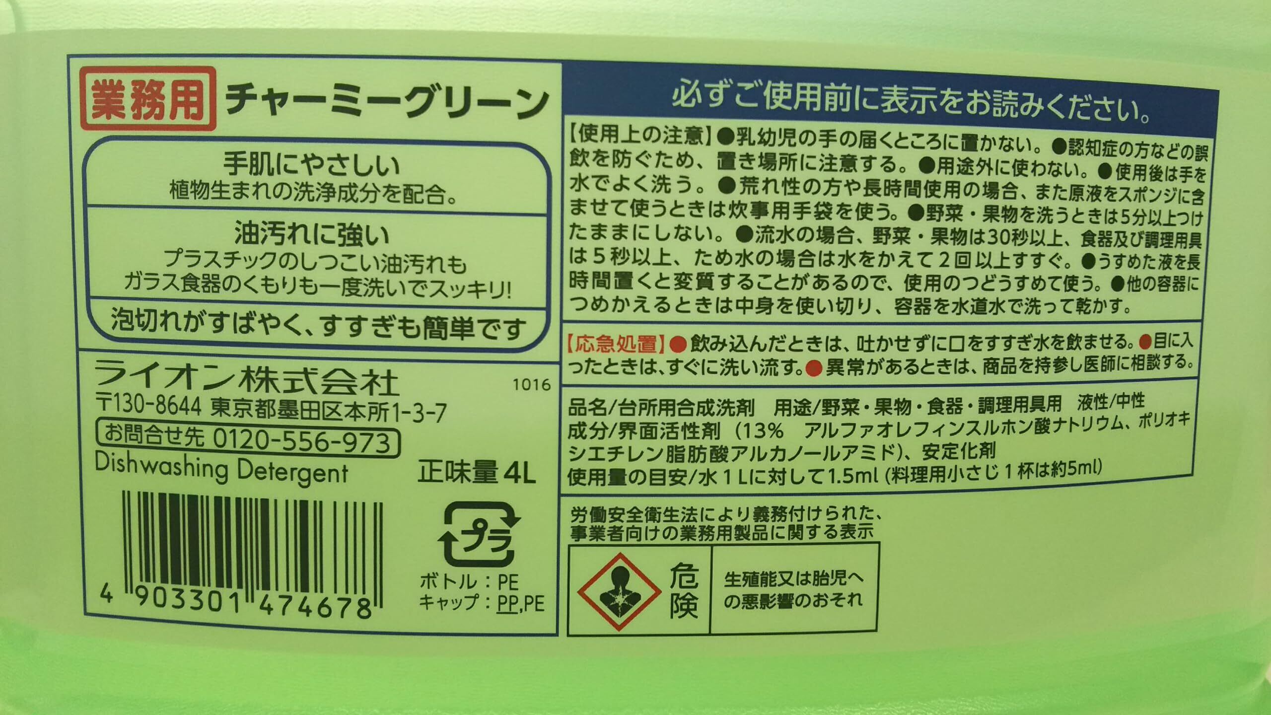 界面活性剤(13%アルファオレフィンスルホン酸ナトリウム、ポリオキシエチレン脂肪酸アルカノールアミド)、安定化剤