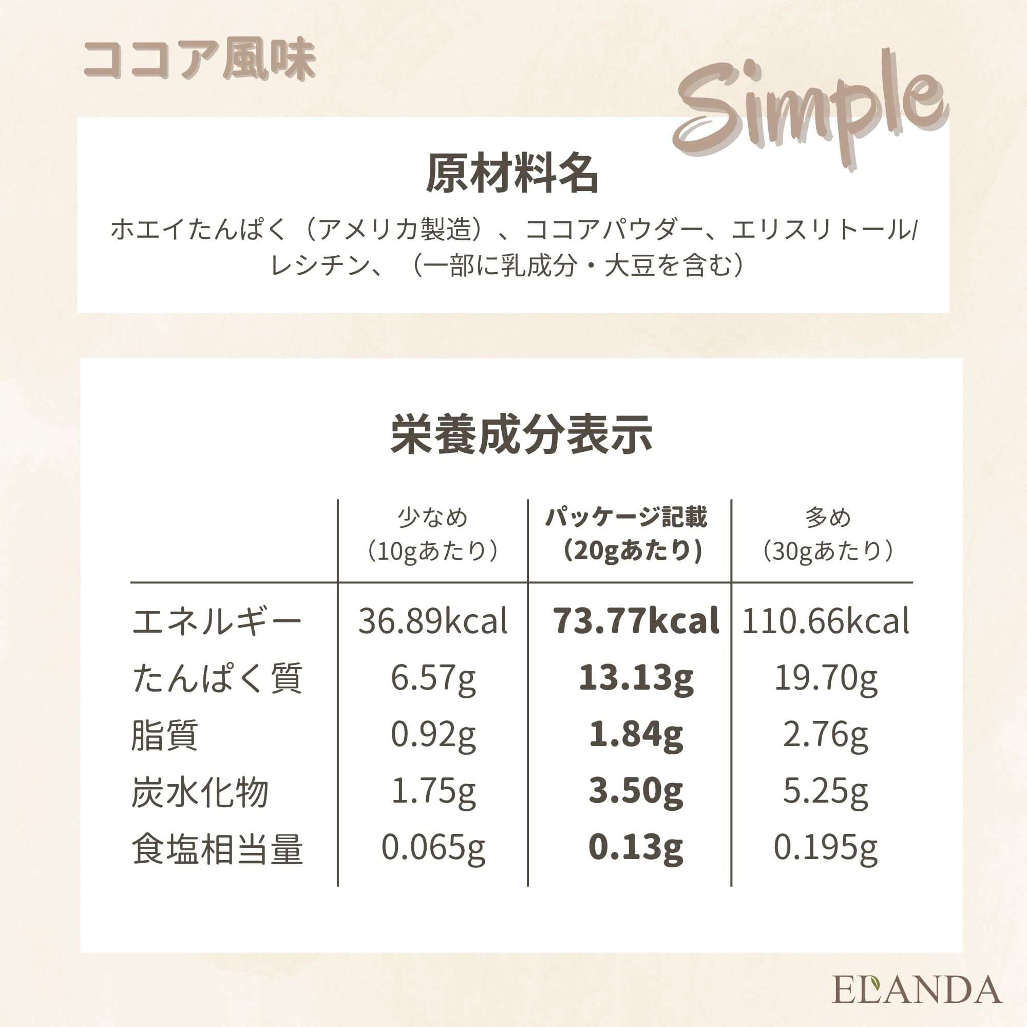 ELANDA(エランダ) 甘くないプロテイン 【ココア風味 個包装 10袋】 ホエイ 人工甘味料不使用 香料 着色料 無添加 飲みやすい 溶けやすい WPC