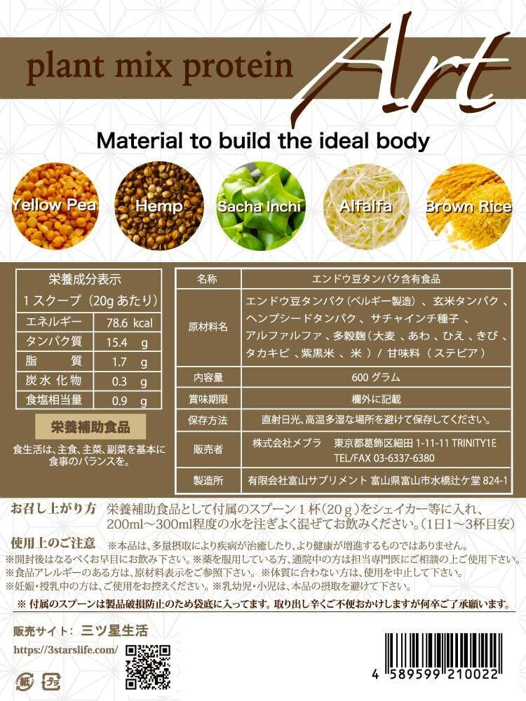 Artプロテイン 600g 植物性プロテイン 5品種ブレンド タンパク質含有量77% 多穀麹配合 無添加 人工甘味料不使用 遺伝子組み換えフリー 重金属検査済み ビーガン対応 プロフェッショナル向け