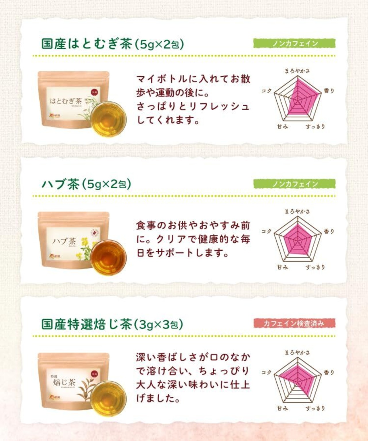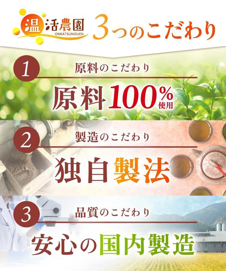 品質の高い原料を選び抜き、日本茶検定1級のお茶のプロが厳しい試作を重ねて、納得のいく味わいを追求しています。素材のおいしさを引き出すと同時に、味にも一切の妥協を許しません。普段ご愛用頂いている方も初めての方にもきっとご満足いただけるギフトです。