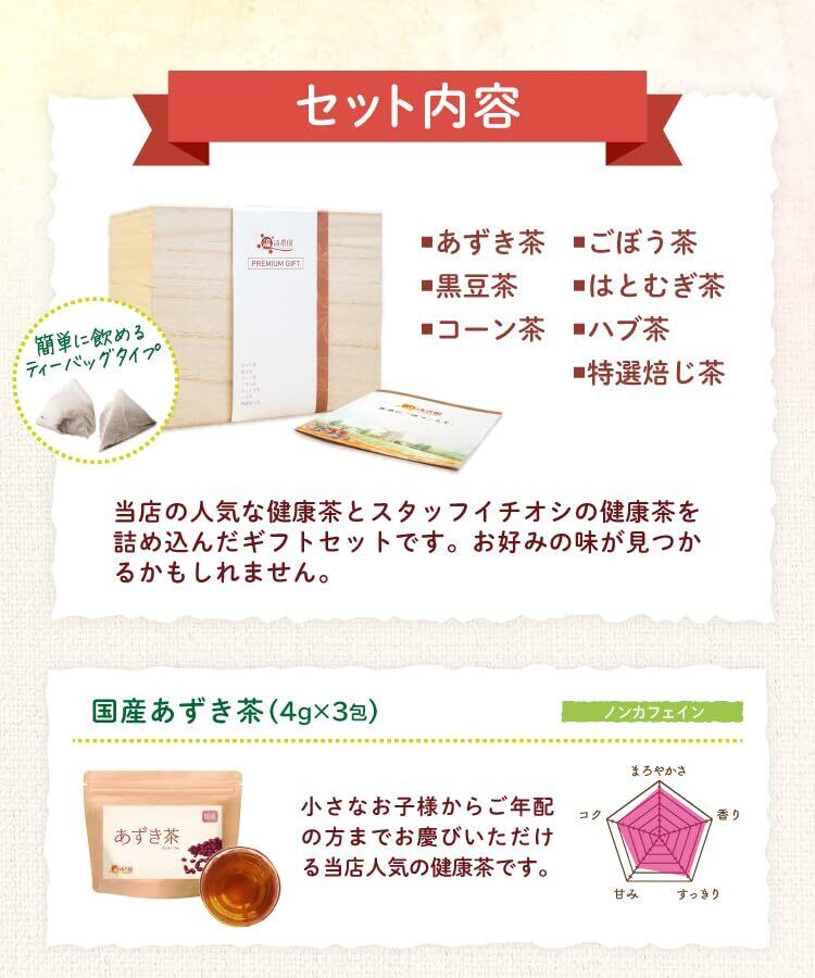 温活農園で大人気の健康茶がプレミアムギフトになりました!あずき茶・コーン茶・黒豆茶・はとむぎ茶・ハブ茶・ごぼう茶・特選焙じ茶の人気7種が入ってます。