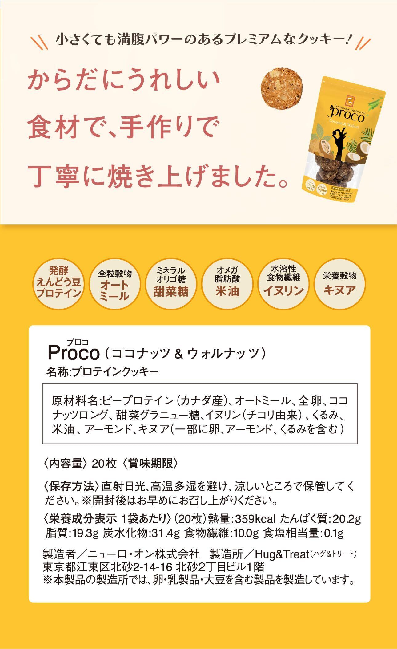 【グルテンフリー サプリになるおやつ】ココナッツの優しい甘さ Proco(プロコ)[ココナッツ&ウォルナッツ] プロテインクッキー 20枚入り×2袋 発酵えんどう豆プロテイン×オートミールでゆで卵6個分のタンパク質&バナナ20本分の食物繊維(2袋換算) イヌリン キヌア 北海道産甜菜糖[ひと口サイズ 満腹感 ダイエット 腸活 小腹満たし 米粉不使用 白砂糖不使用 添加物不使用]ビスコッティ風の美味しさ Hug&Treat