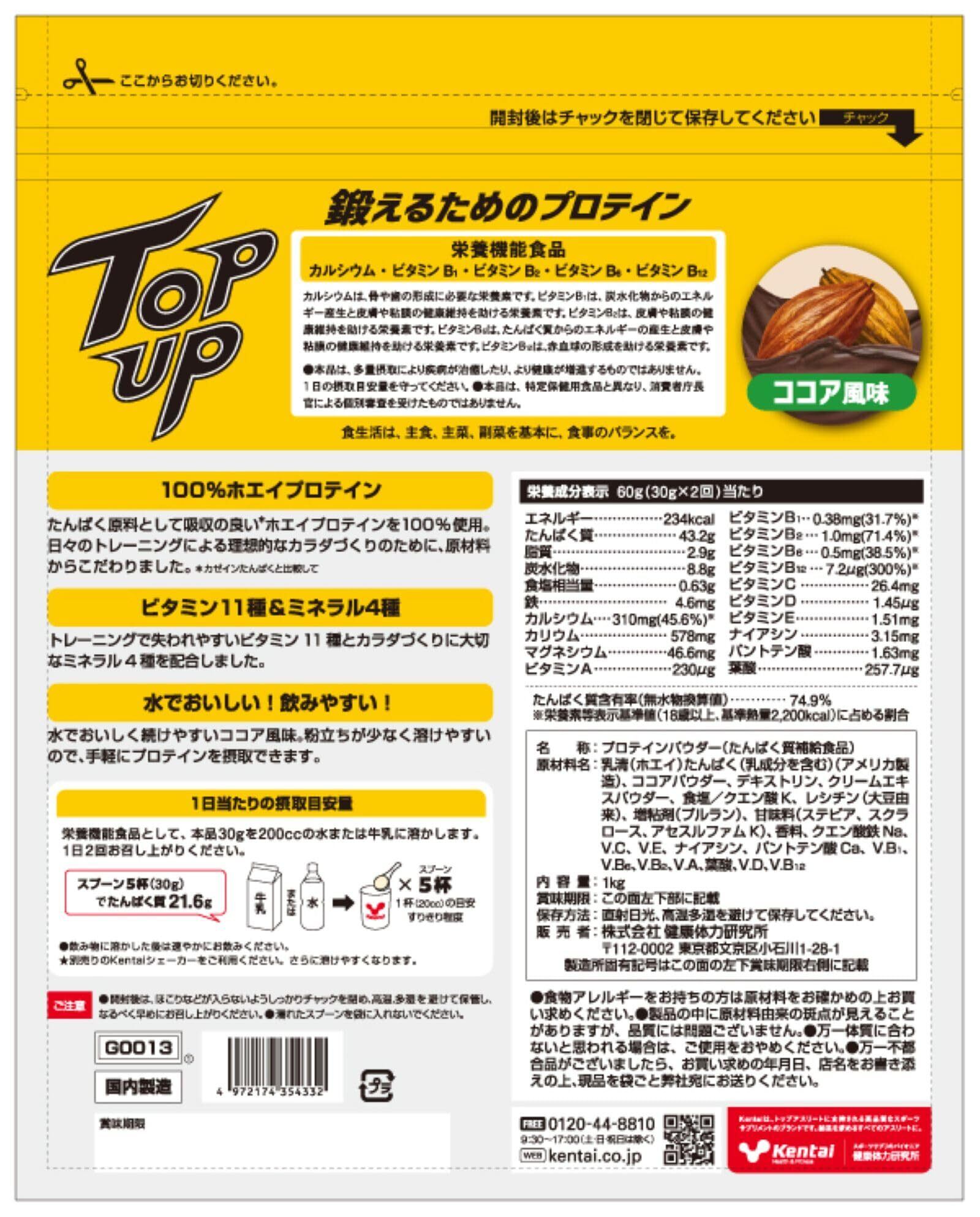 Kentai ケンタイ TOP UP ホエイプロテイン ココア 1kg【ビタミン11種 × ミネラル4種】栄養機能食品 国内製造 WPC ホエイ プロテイン whey protein