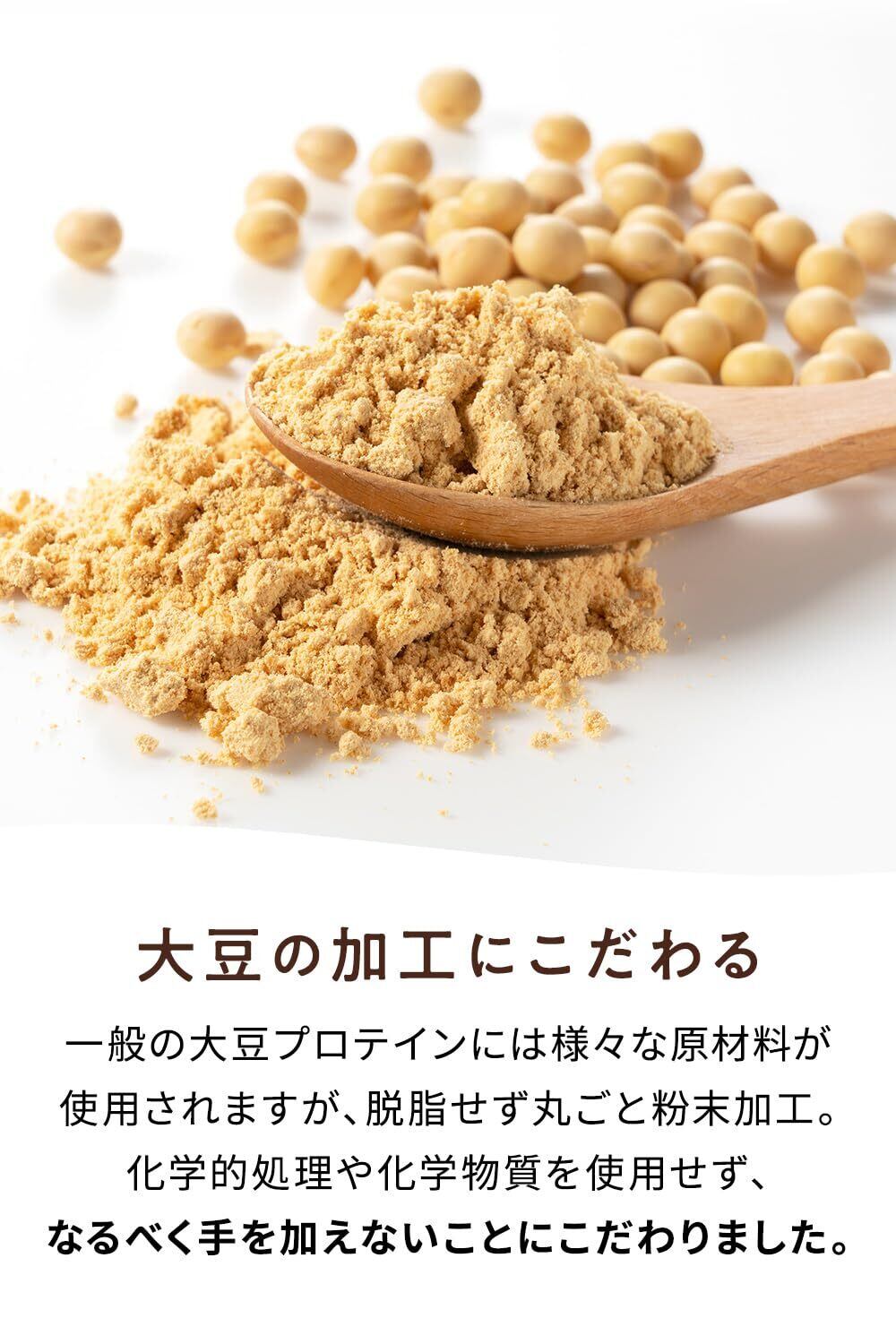 【大豆の加工にこだわる】一般的な大豆プロテインは大豆から油分を取り除いた脱脂大豆を使って製造しますが、脱脂する際に化学溶剤を使用して油分を抽出するやり方が大半です。国産有機まるごと大豆プロテインは独自技術により大豆を丸ごと脱脂せずに加工して使用しています。