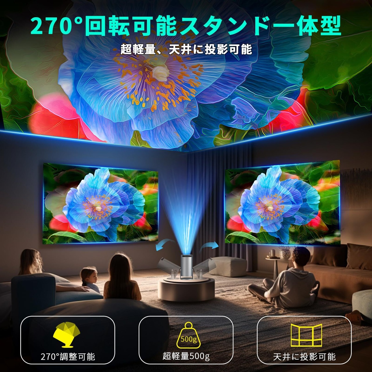 プロジェクター 家庭用【最新進化Android TV搭載!・4K対応・270°回転】プロジェクター 小型 軽量 天井投影 Wi-Fi6 接続Bluetooth5.4 リアル1080P高輝度 内蔵HiFiスピーカー 自動台形補正 短距離投影 ホームプロジェクター スタンド一体型 iOS & Androidスマホ/パソコン/DVD/PS機/Switch/などに対応 ぷろじえくたー 日本語取扱説明書