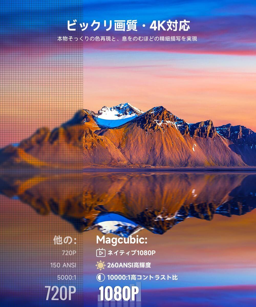 次世代ホームプロジェクター・20000LM超光量:新しく開発された高精度の小型レンズを搭載し、明るさが20,000ルーメンまで向上しました。1920×1080のフルHD解像度と4K対応技術により、細かい部分までくっきりとした映像を再現できます。NTSC色域の99%以上をカバーするので、自然に近い色味で動画や画像を映し出せます。さらに、10,000:1の高コントラスト比で、暗い場面でもはっきりと見えるようにしました。専用のスクリーンがなくても、白い壁があればドラマと映画などを投影でき、自宅で映画館のような体験が楽しめます。プロジェクターは直射光より柔らかい拡散光を使っているので、子供やお年寄りが長い時間アニメやテレビ番組を見ても、目が疲れにくい設計です。
