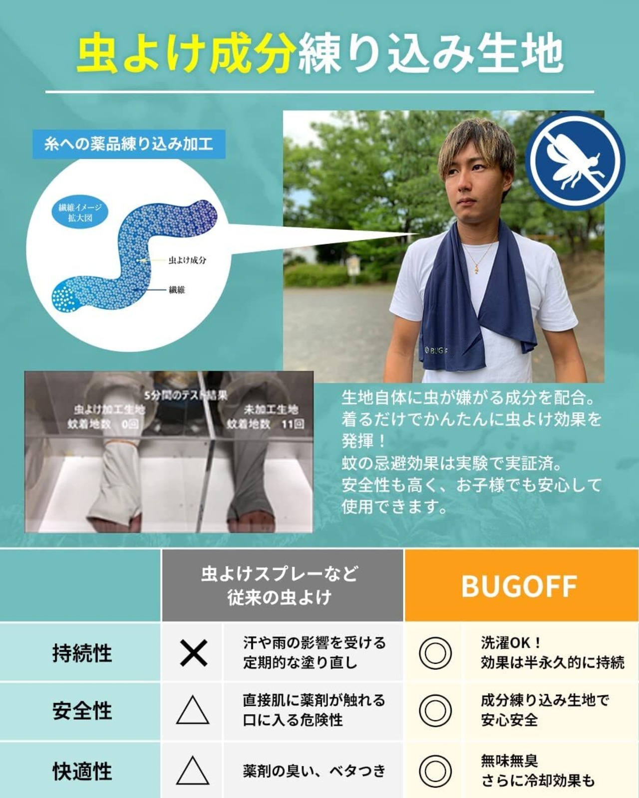 【虫よけ成分配合生地】生地自体に虫よけ成分を配合し、身につけるだけで手軽に虫よけ効果を発揮。洗濯しても効果は半永久的に持続。虫よけスプレーなど従来の虫よけ対策のように、薬剤を使用しないので子どもにも安心安全。臭いやベタつきもない新しい形の”着る”虫よけです。
