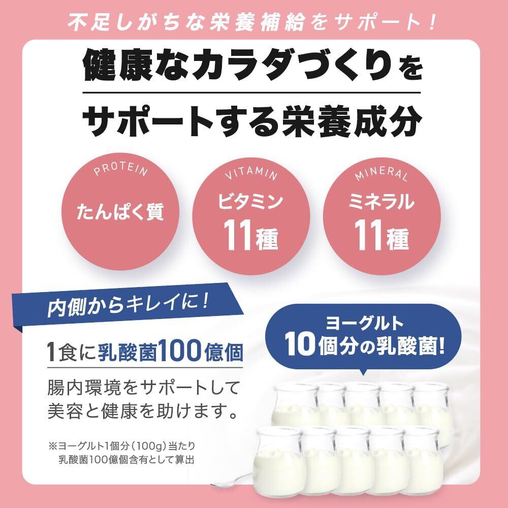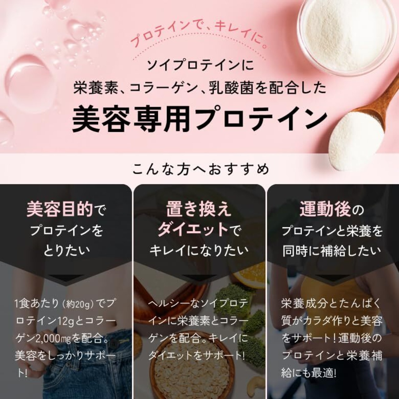 【オールインワン美容プロテイン】1食(20g)当たりたんぱく質12g、ビタミン11種、ミネラル11種、乳酸菌100億個、コラーゲン2000㎎を配合した女性向けの美容プロテインです。これ1つで栄養補給しながら美容をサポートします。