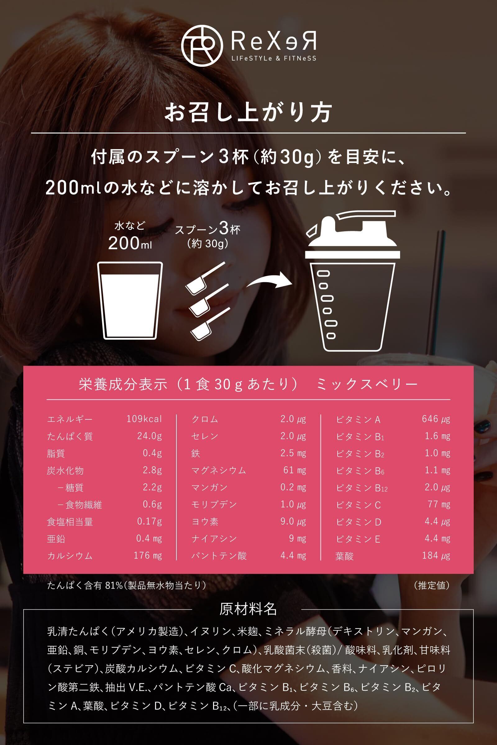 【ISO22000認定】 ReXeR レクサー ホエイ プロテイン WPI100% 国内製造 900g ビタミン11種配合 人工甘味料不使用 ミックスベリー