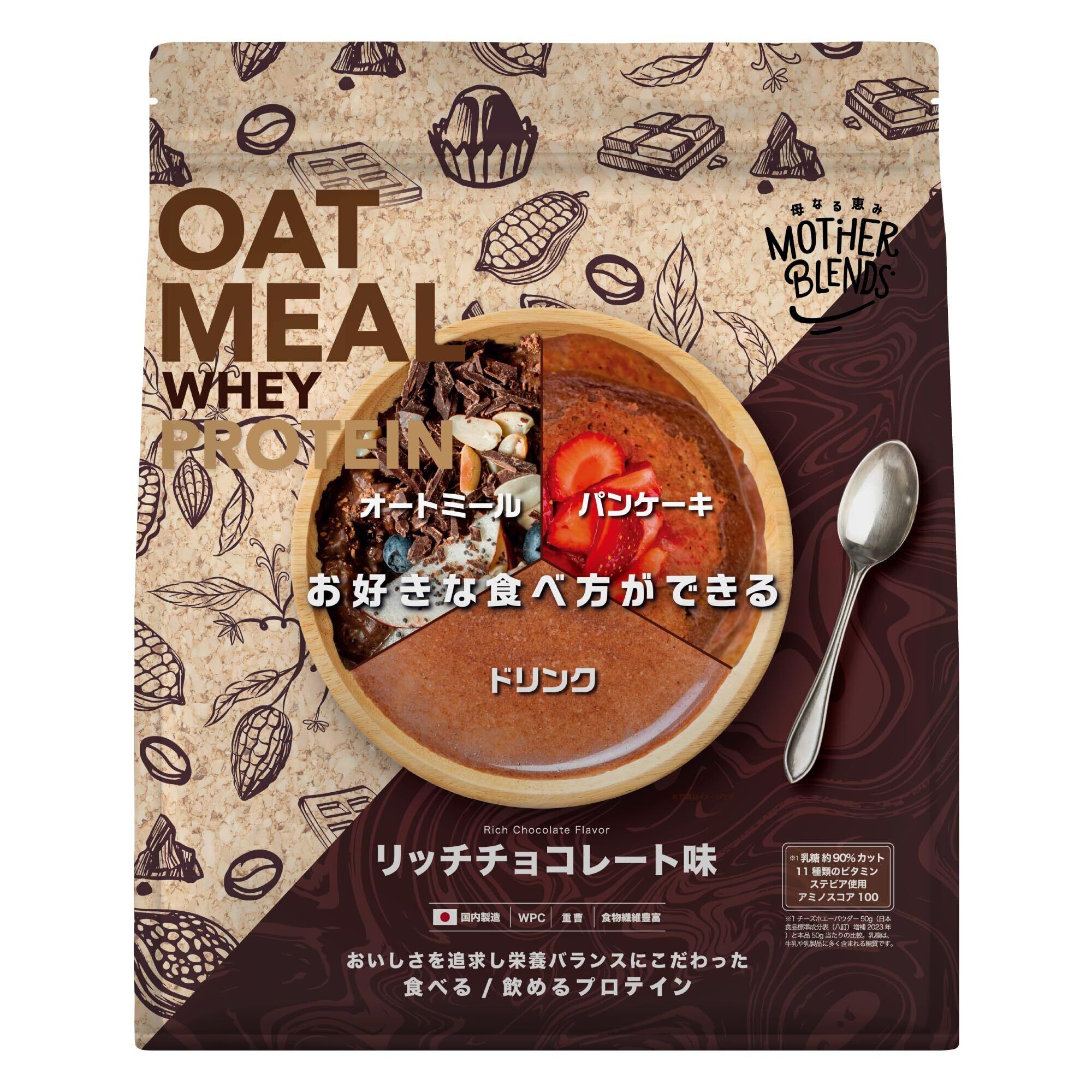 マザーブレンズ ホエイ ソイ プロテイン 乳糖 99%カット 人工甘味料不使用 オートミール 粉末 食物繊維 豊富 wpc 食べる 飲める オールインワン マルチビタミン 13 種配合 (900g, リッチチョコ)