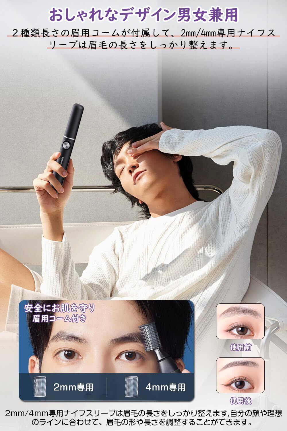 【革新的技術30°回転設計・デュアルサイズ刃】 眉毛シェーバー メンズの最新技術のヘッド部が30°回転する設計のため、肌に密着し、細かい部分もきれいに剃ることができます。 通常眉毛カッターの幅広刃に加え、眉毛を整える際に細かい形状を作るための小型刃を追加しました。 フェイスシェーバーは2mm/4mmのロングのショートコームが付属しており、簡単に形を整え、長さを調節して理想の眉に仕上げることができ、初心者でも簡単に使うことができます電気シェーバー 。