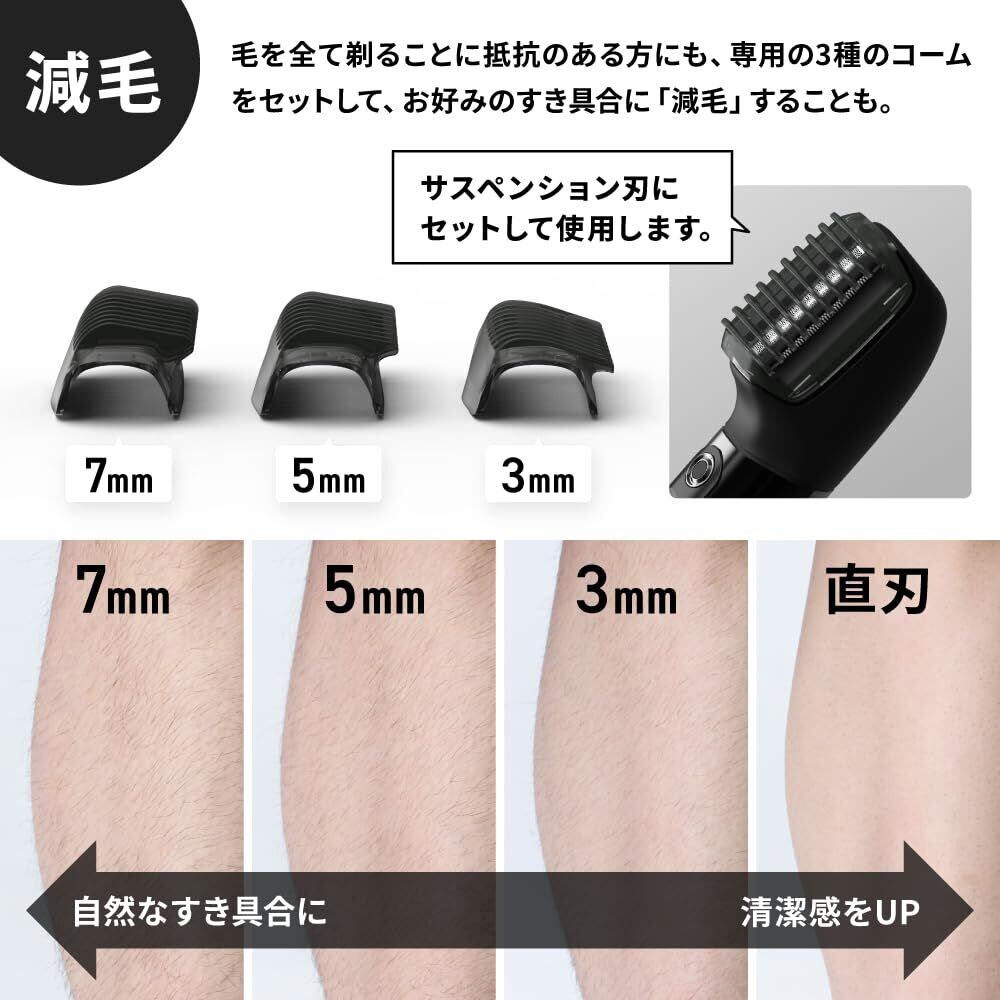 毛の長さを整えるためのトリマーアタッチメントも付属。7mm、5mm、3mmの長さでカットできる3種のアタッチメントで、お好みの長さに整えることができます。 毛の無い状態に抵抗のある方でもお使いいただけます。多い毛をすいて減毛し、毛の長さを整えることでより洗練された清潔感を保つことができます。