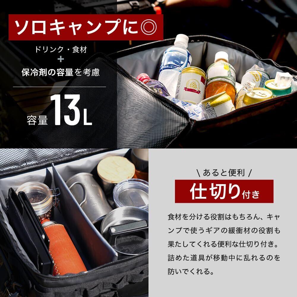 ソロキャンプに最適な容量13Lのソフトクーラーバッグです。このクーラーバッグはバイクに積載しやすい設計で、キャンプ場まで移動するのにも便利です。350ml缶を縦に20本収納できる大容量で、合わせて保冷剤もついて収納可能です。