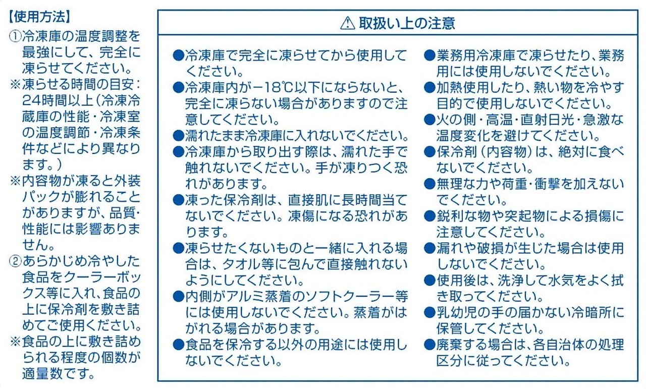 備考:冷凍庫で凍らせてください。繰り返し何度でも使えます。一般保冷剤・氷との併用で保冷効果がアップ。原産国:日本