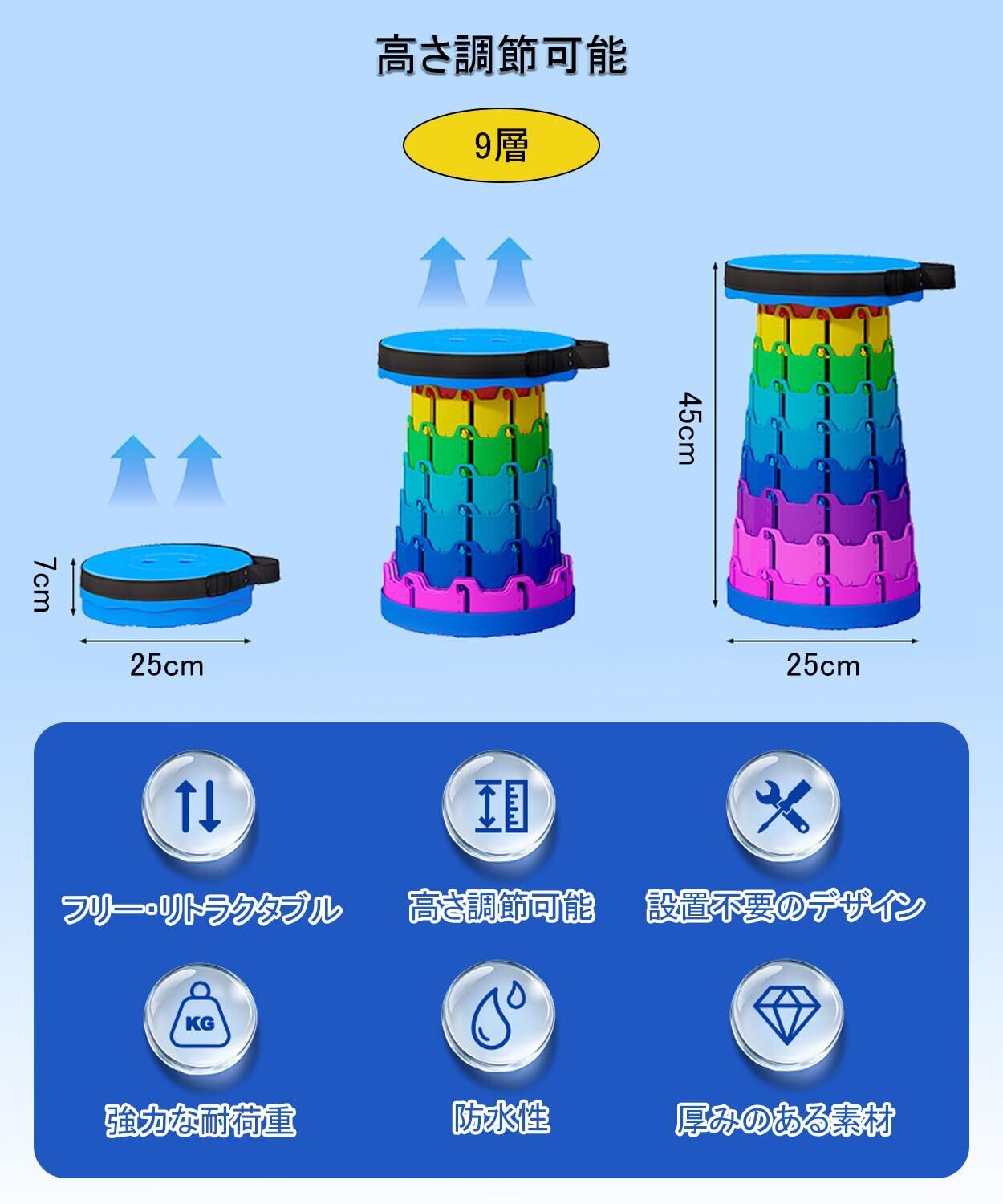 【高い耐荷重能力】わずか1キログラムの軽さにもかかわらず、当社の伸縮式アウトドアチェアは最大150キログラムの重量に耐えることができます。これは、頑丈なABSとポリアミド素材を使用し、9つの高さ調整と固定デザインを採用したためです。その結果、非常に安定性が高いです。