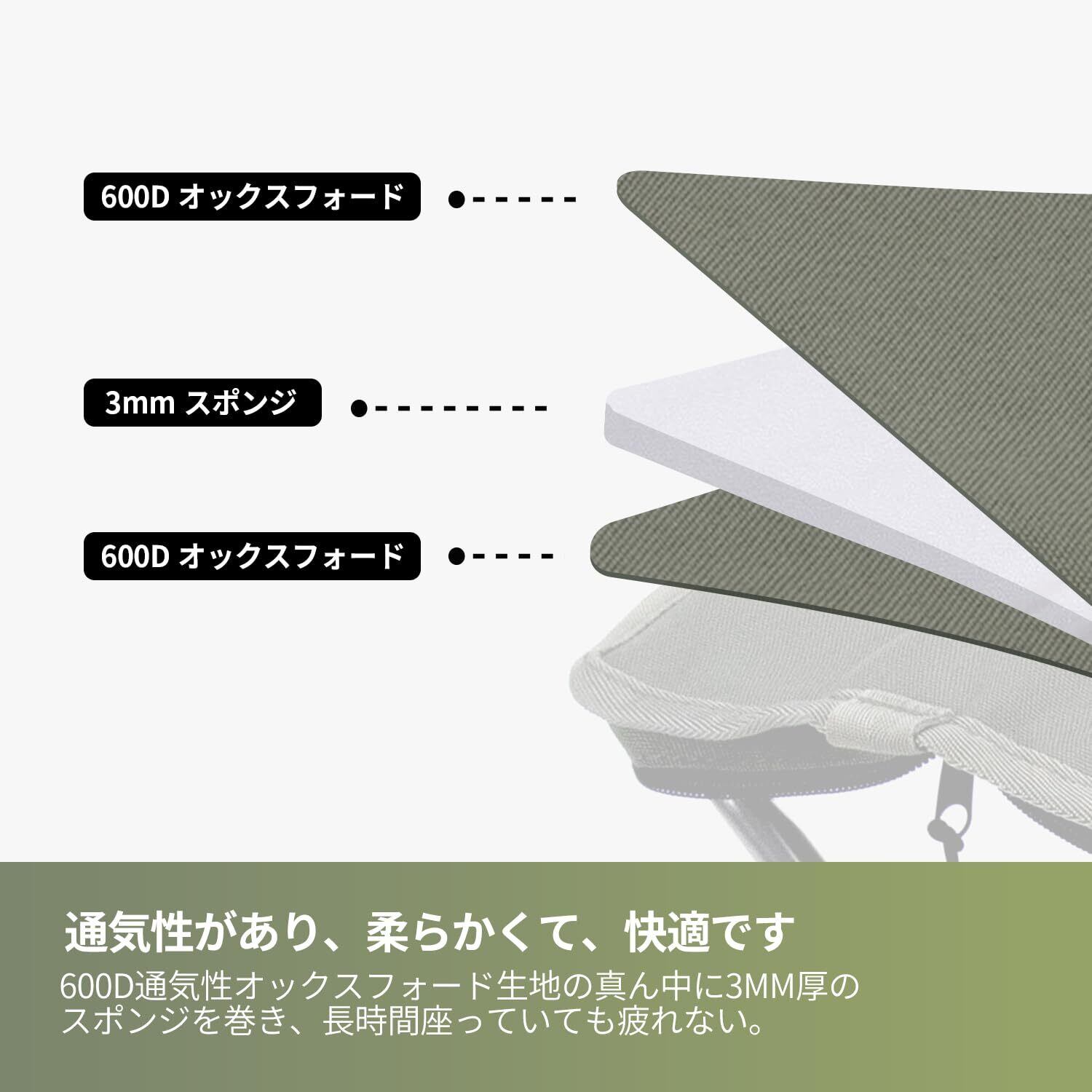 【軽量かつ安定性も抜群】優れた強度と超軽量の骨組みで軽量かつ安定性も抜群です。座面は600Dの厚手で丈夫な生地を使い、張りのある安定した座り心地と耐久性を兼ね備えました。また採用のオックスフォード生地は通気性もよく、快適に過ごすことができます。