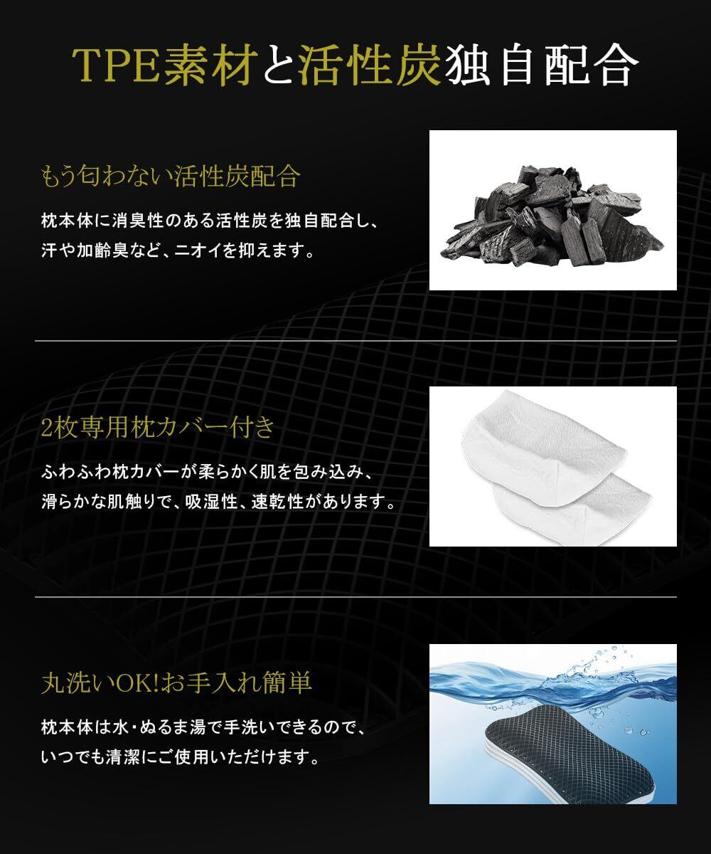 【ムレ・ニオイ対策】黒い理由は活性炭を独自配合しているから。高い伸縮性と弾力性に富んだジェル素材には消臭・抗菌・調湿効果のある活性炭を配合。さらに通気構造で熱や湿気がこもらず、ダニ・カビ・細菌などがつきにくく、ムレ・ニオイの原因を防ぎます。頭に熱がこもらないので、快適な寝心地が一晩中続きます。