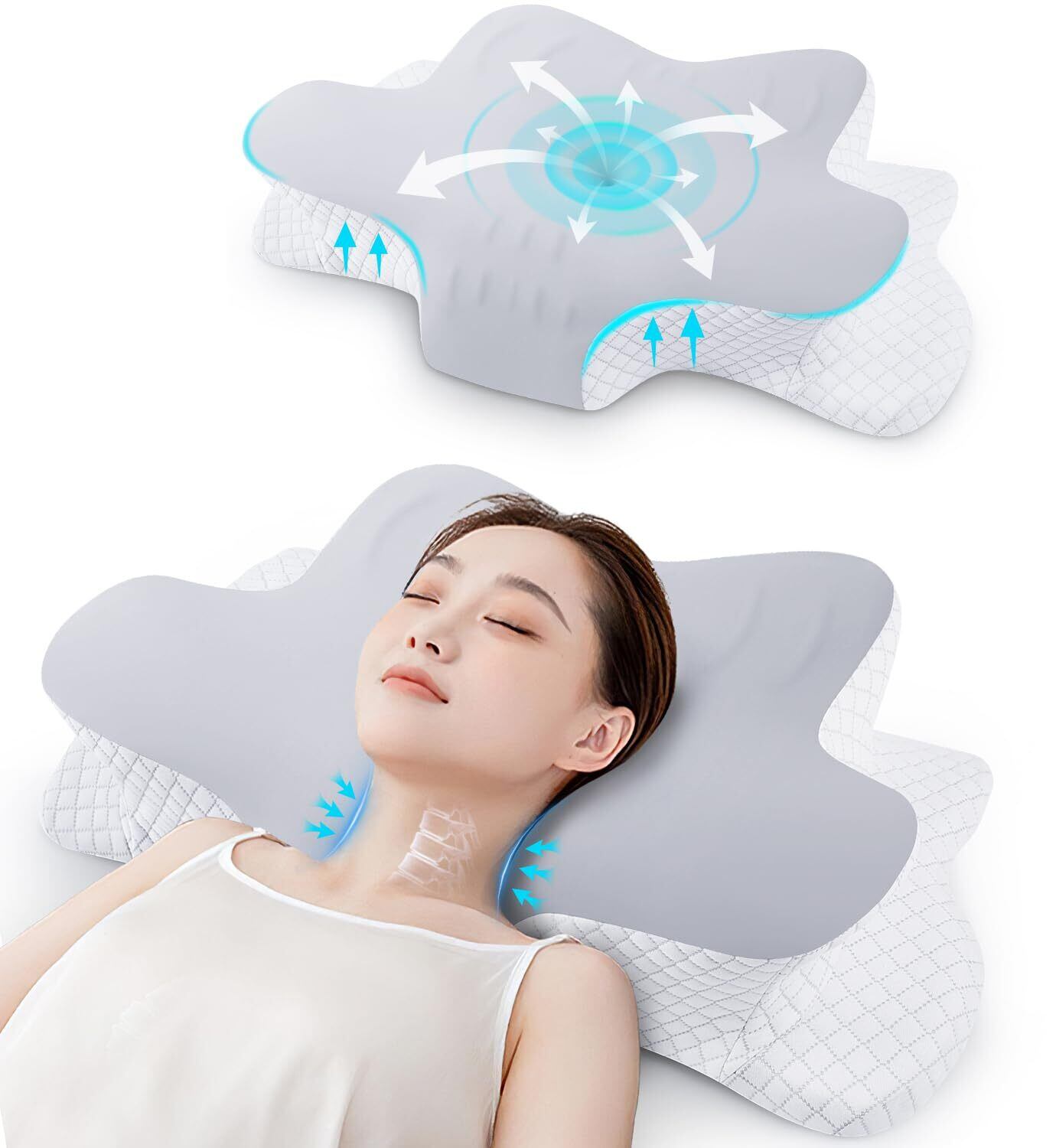 【すべての寝姿勢に対応】中央のくぼみと両側カーブの立体設計で、頭・首・肩をしっかりサポート。■仰向け寝では頭部と首への圧力を分散、姿勢を安定させることで、無意識な寝返りを減らし、睡眠の質を向上させます。■横向き寝時には、両側の高め設計が頭から肩までを最適に支え、頚椎の自然なカーブを保持。頭から肩までの圧力を軽減し、より快適な睡眠を実現します。仰向けでも横向きでも、重心が真っすぐになり、気道が確保され呼吸が楽になります。■さらに腕置きサポート設計により、横向き/うつ伏せ寝時の腕の圧迫を解消。朝までぐっすり眠れます。