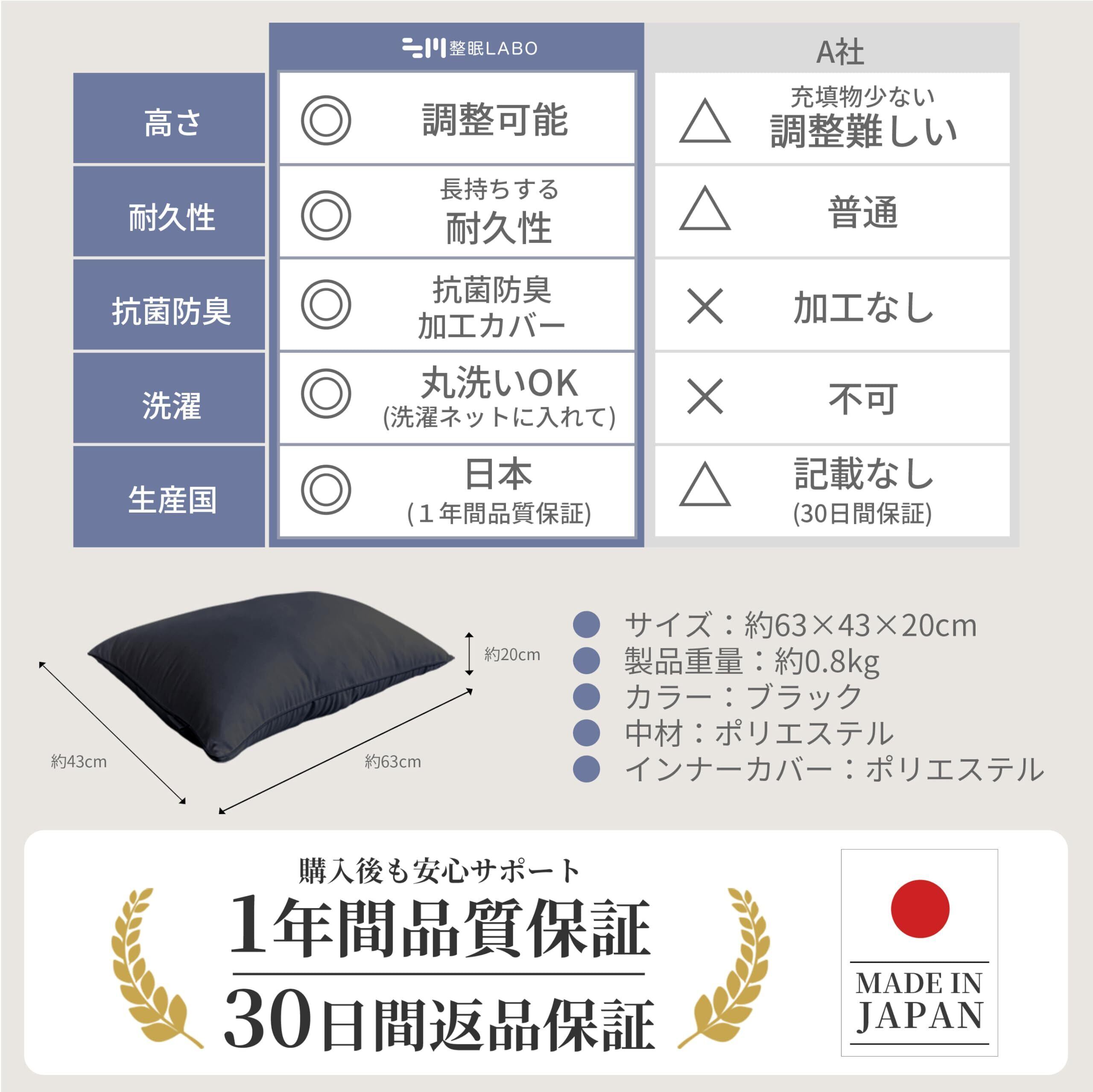 整眠ラボ 枕 まくら 日本製 ホテル枕 ふわふわ感 横向き対応 丸洗い可能 安眠 寝心地良い 63x43cm 首が痛くならない 首・肩フィット (ブラック)