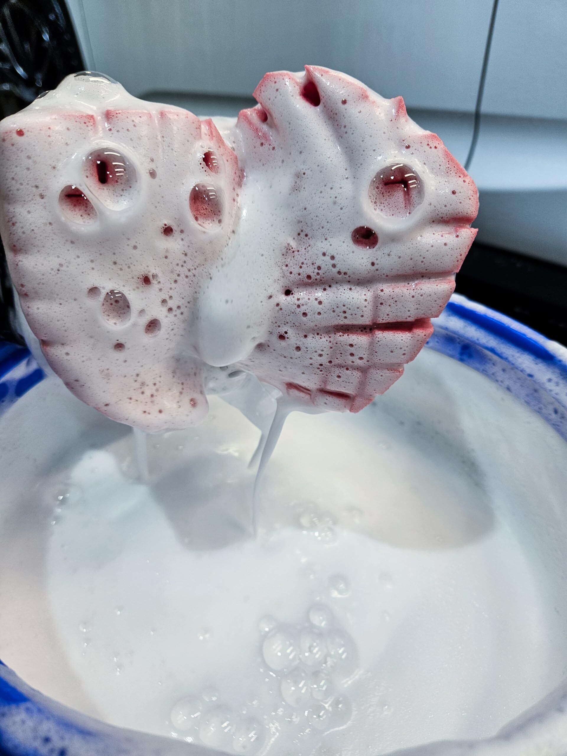 スポンジ表面に無数に入った切れ込みは、市販の通常のスポンジに比べて、より多くの水とシャンプー液を保持できる性能を持っています。