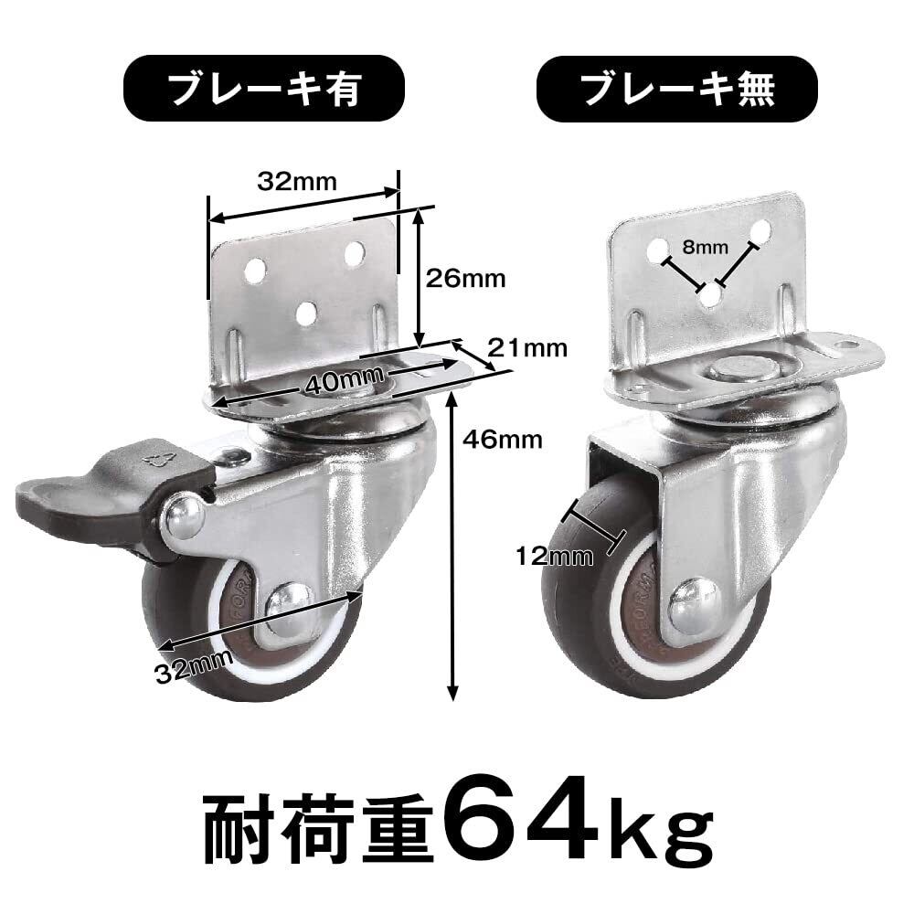 L型 キャスター 4個セット L型プレート ブレーキ付き 耐荷重 64kg 自在車 キャスター 静音 ネジ付き ゴム車輪 1.25インチ キャスター 簡単設置 DIY (自在車2個+ブレーキ付2個)