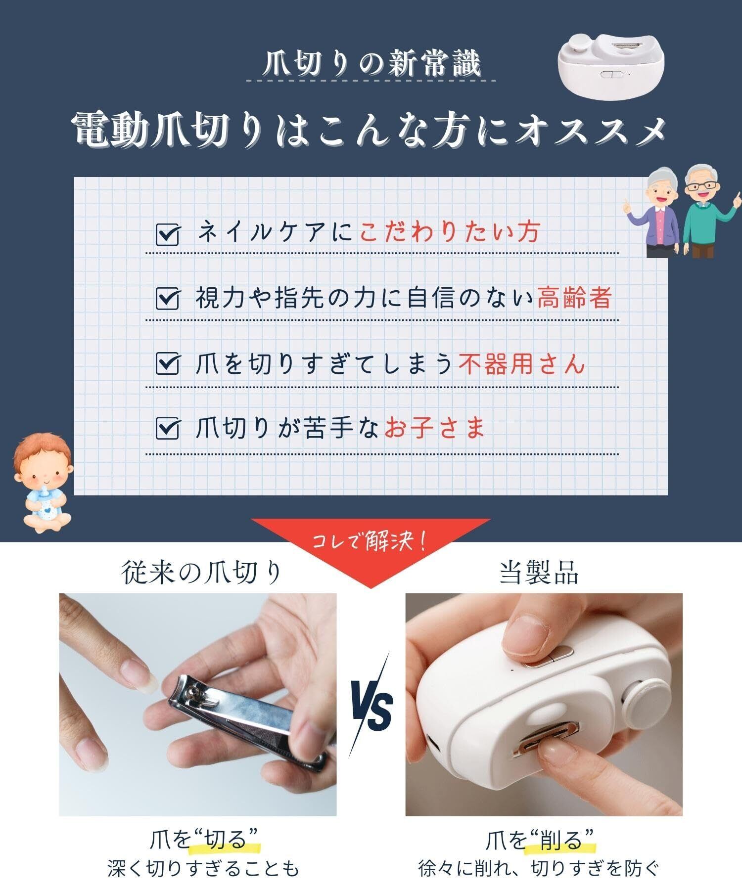 【安全安心】回転刃部分に爪を押し当てるだけなので、子供/お年寄り誰でも簡単にお使いいただけます。深爪にならない安心設計!!チャイルドロック機能がついているので誤って起動することがありません。LEDライト搭載で手元が見やすく安心。