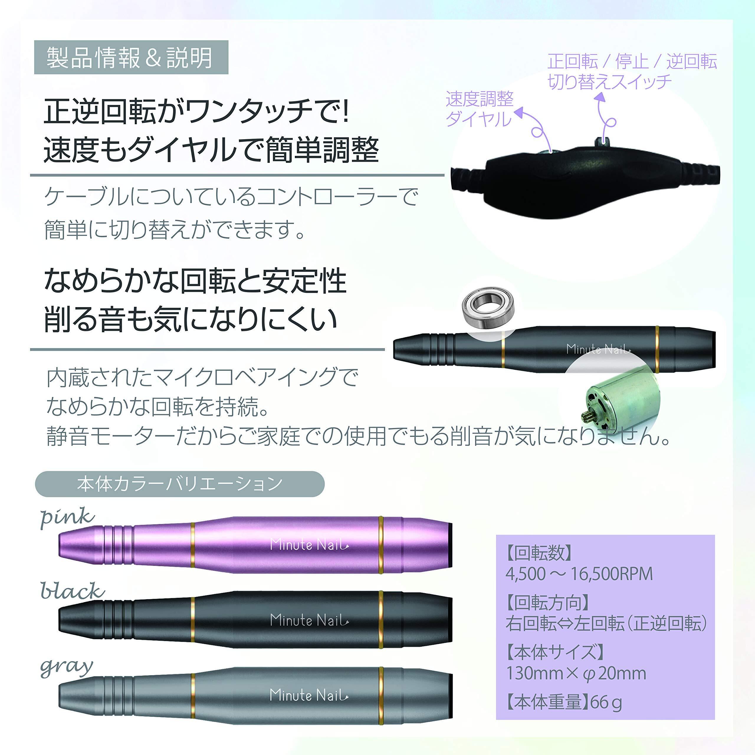 「回転方向切り替えスイッチ」・「スピード調節ダイヤル」が ネイルマシン本体に付いているので指一本で簡単に操作することが 可能です。指滑り止めでしっかり握れて、手になみます。