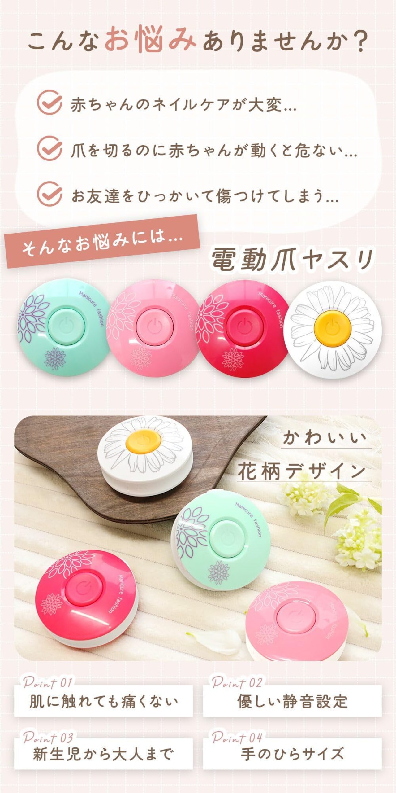 【新生児から大人まで使える】赤ちゃんから高齢者まで幅広く使える電動爪やすり。柔らかく安全なアタッチメントで爪をやさしくケア。