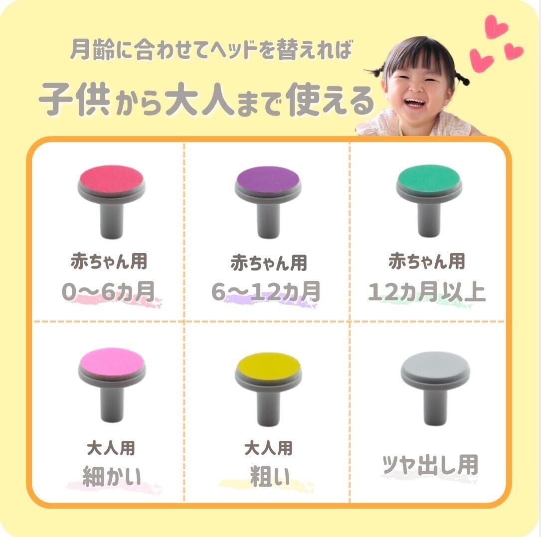 電池式ネイルケアセット アタッチメント付き 新生児から大人まで使える アタッチメント付きの電動ネイルケアセット! 本体 アタッチメントヘッド6種類 0-6ヶ月/6-12ヶ月/12ヶ月以上/大人用(細)/大人用(粗)/艶出し用 ※別途単4電池が1本必要です。