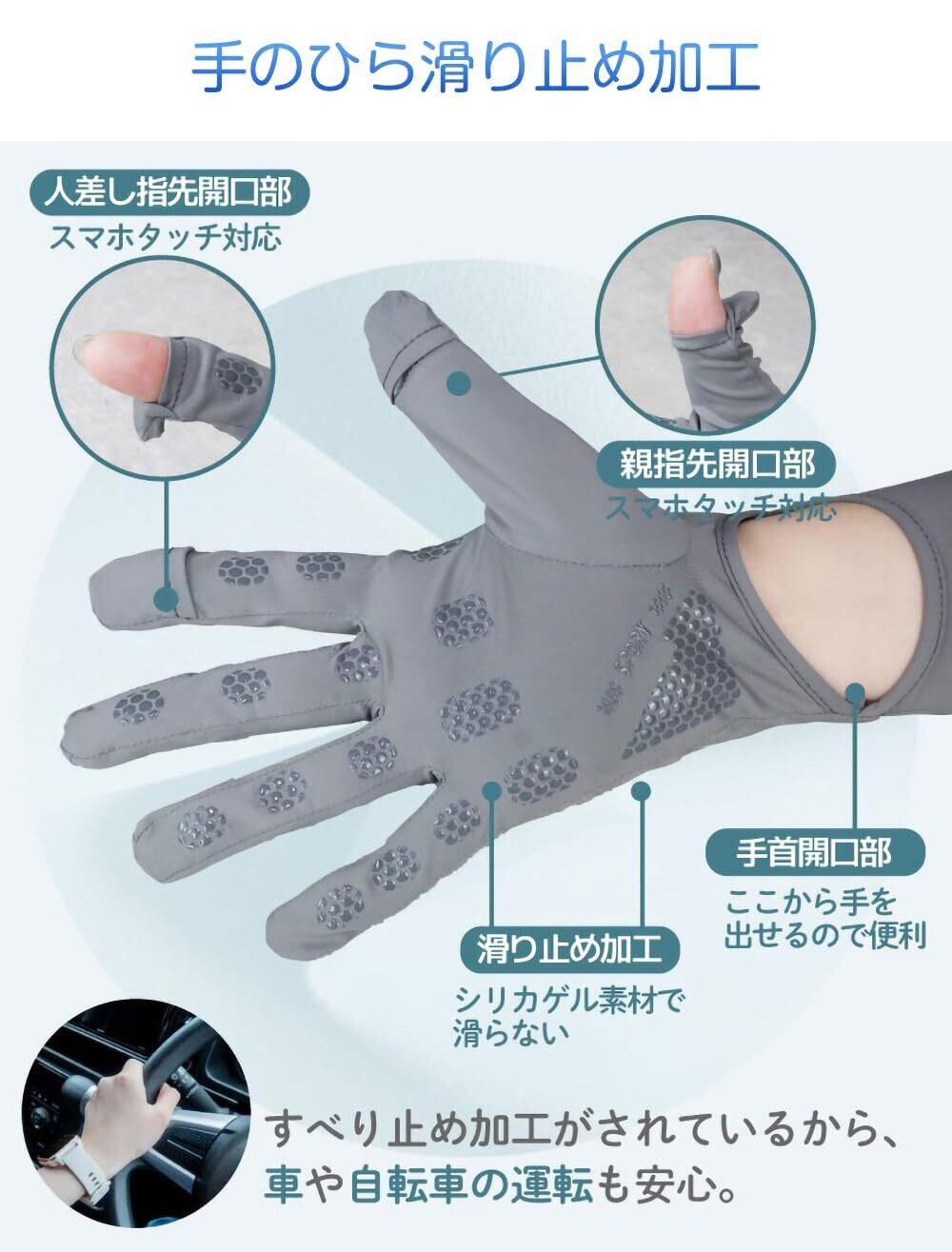 【滑り止め効果抜群】手のひらの裏部分にシリカゲル加工で滑り止め効果が抜群、ハンドル操作やサイクリング、釣り時のハンドグリップを向上させます!接触冷感の素材を採用しておりますので、付ける瞬間にひんやりと感じられ、伸縮性が良く、ストレスフリーな着け心地!