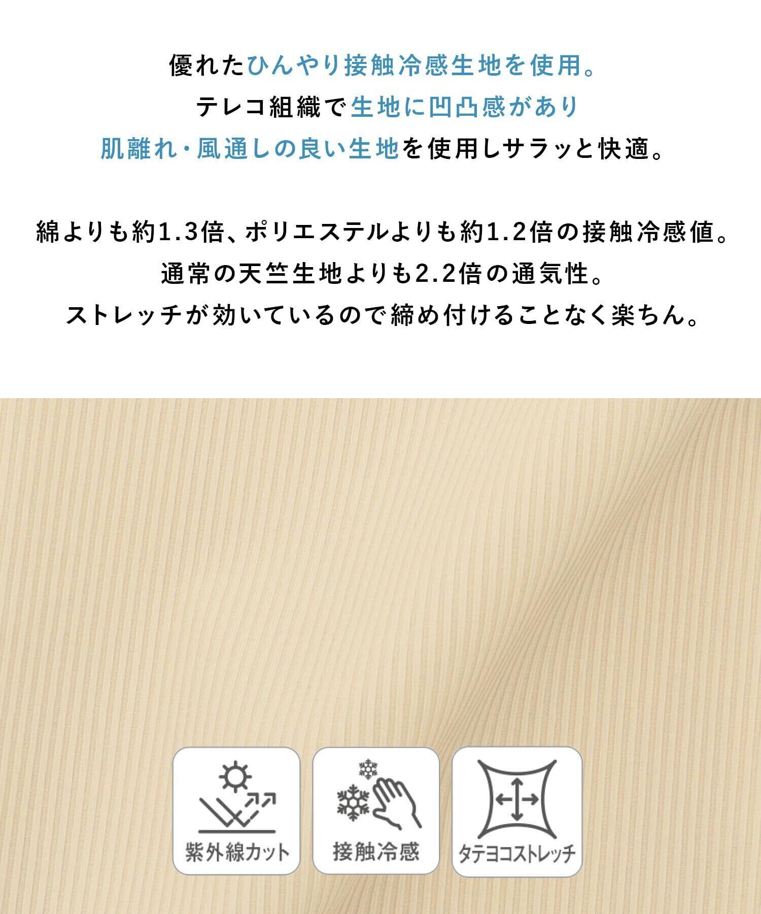 ■ポイント①:優れたひんやり接触冷感生地を使用。テレコ組織で生地に凹凸感があり、肌離れ・風通しの良い生地でサラッと快適に過ごせます。