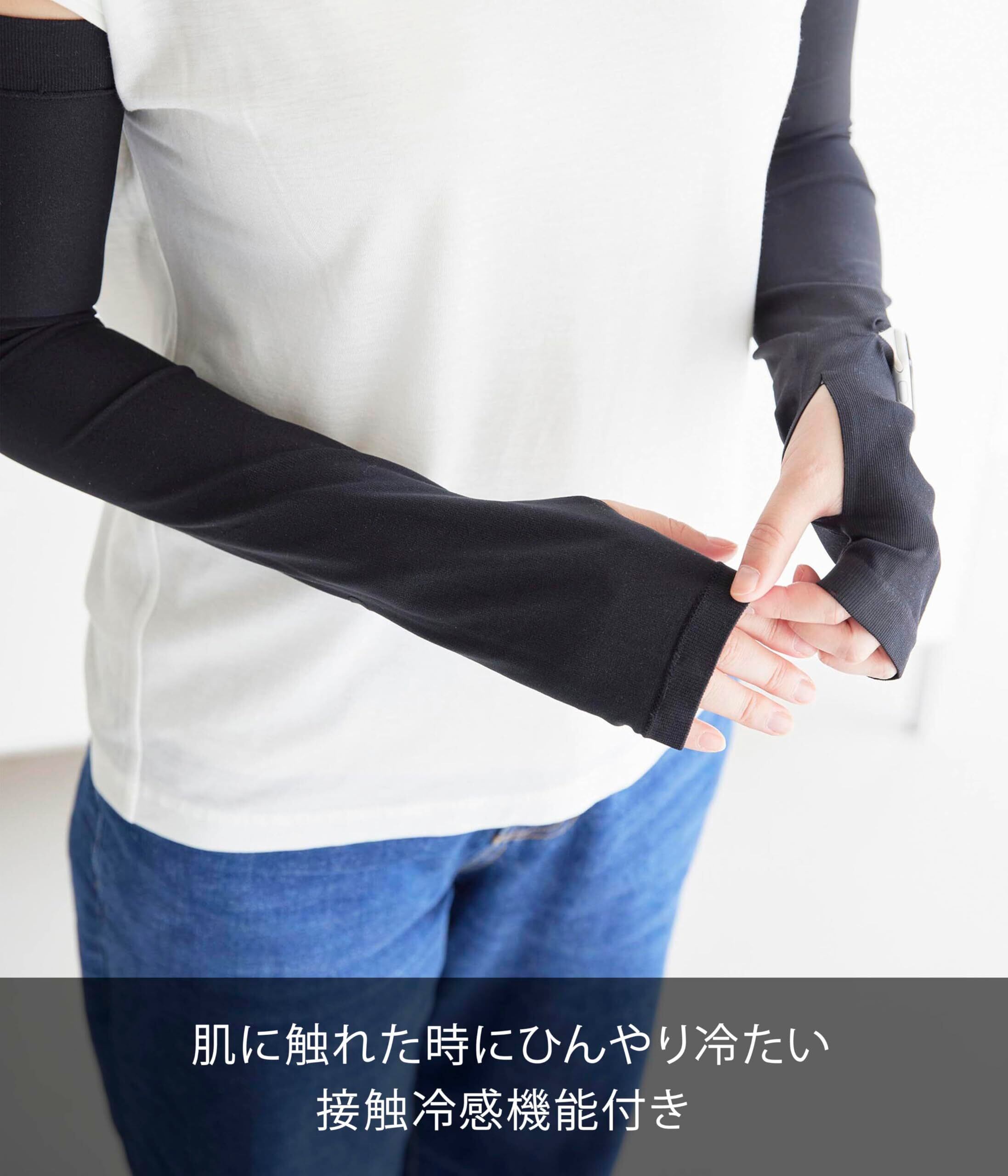 ロング丈なので二の腕まで紫外線対策ができ、 肌に触れた時にひんやり冷たい接触冷感機能付き。