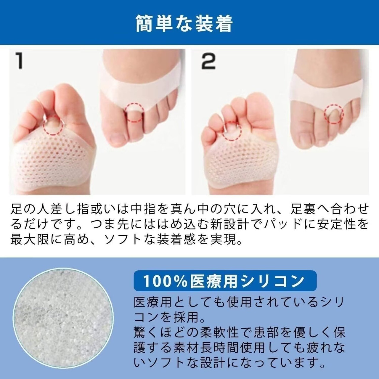【簡単装着】 装着はとっても簡単ラクラク足の第二指(人差し指)1本にはめて、足裏へ合わせるだけです。靴下やストッキングを上からはけば、さらにピッタリフィット。指に固定してあるので靴の中で滑りにくく、横ズレしにくいシリコンパッドです。肌触りも滑らかで抜群!柔らかで伸縮性抜群だから着用時に違和感がありません。