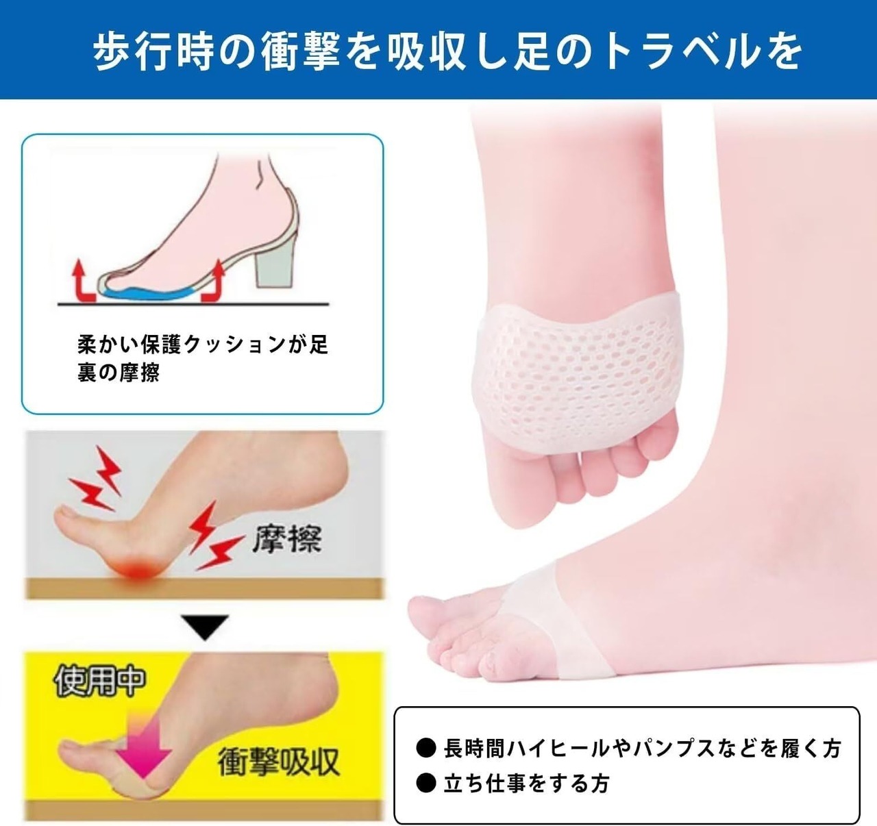 【適応対象】底まめ、タコ、ウオノメなどができて痛い時に、足裏保護パッド(特殊ジェル)が足裏のつけ根部分のかたくなった部分や痛い部分にフィットし、パンプスやヒールからくるズキズキにお困りの方におすすめ!