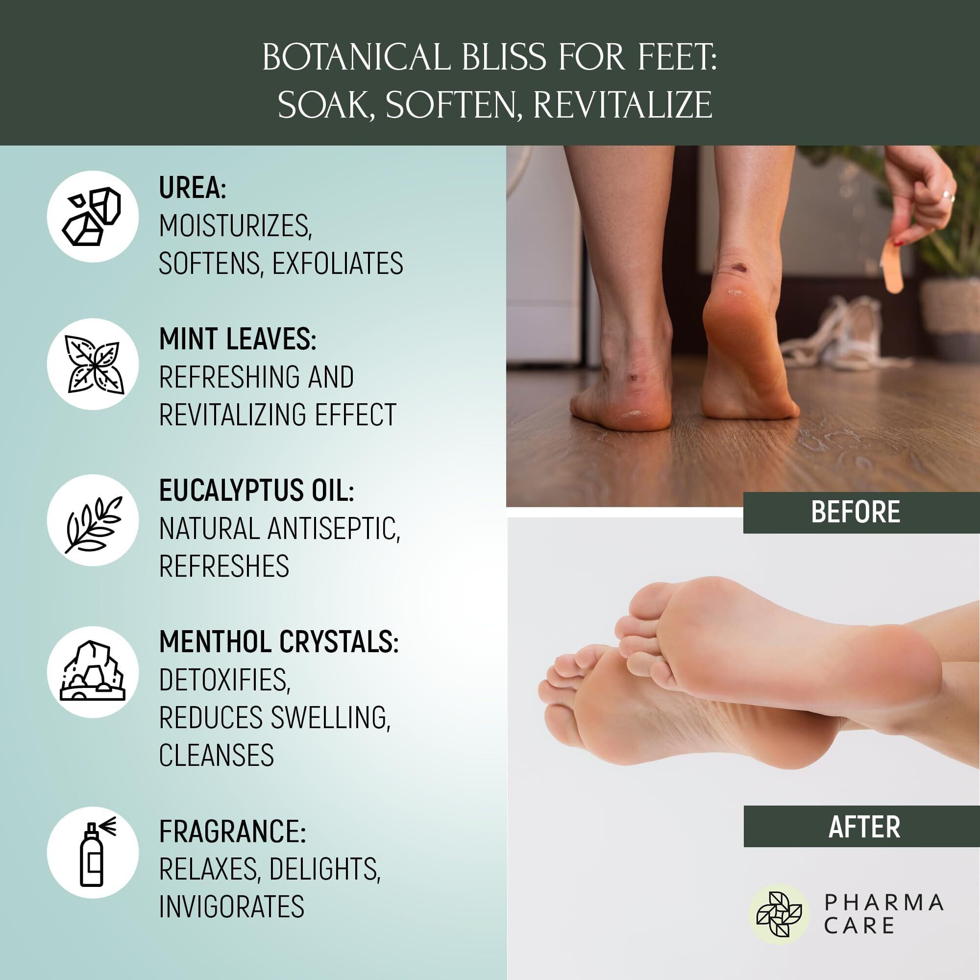 ミント、メントール、尿素、ユーカリオイルを配合した天然フットバスソルトは、疲労やむくみを癒しながら、活力を蘇らせるでしょう。組成物に含まれる尿素が皮膚に深く潤いを与え、かかとの乾燥を防ぎます。