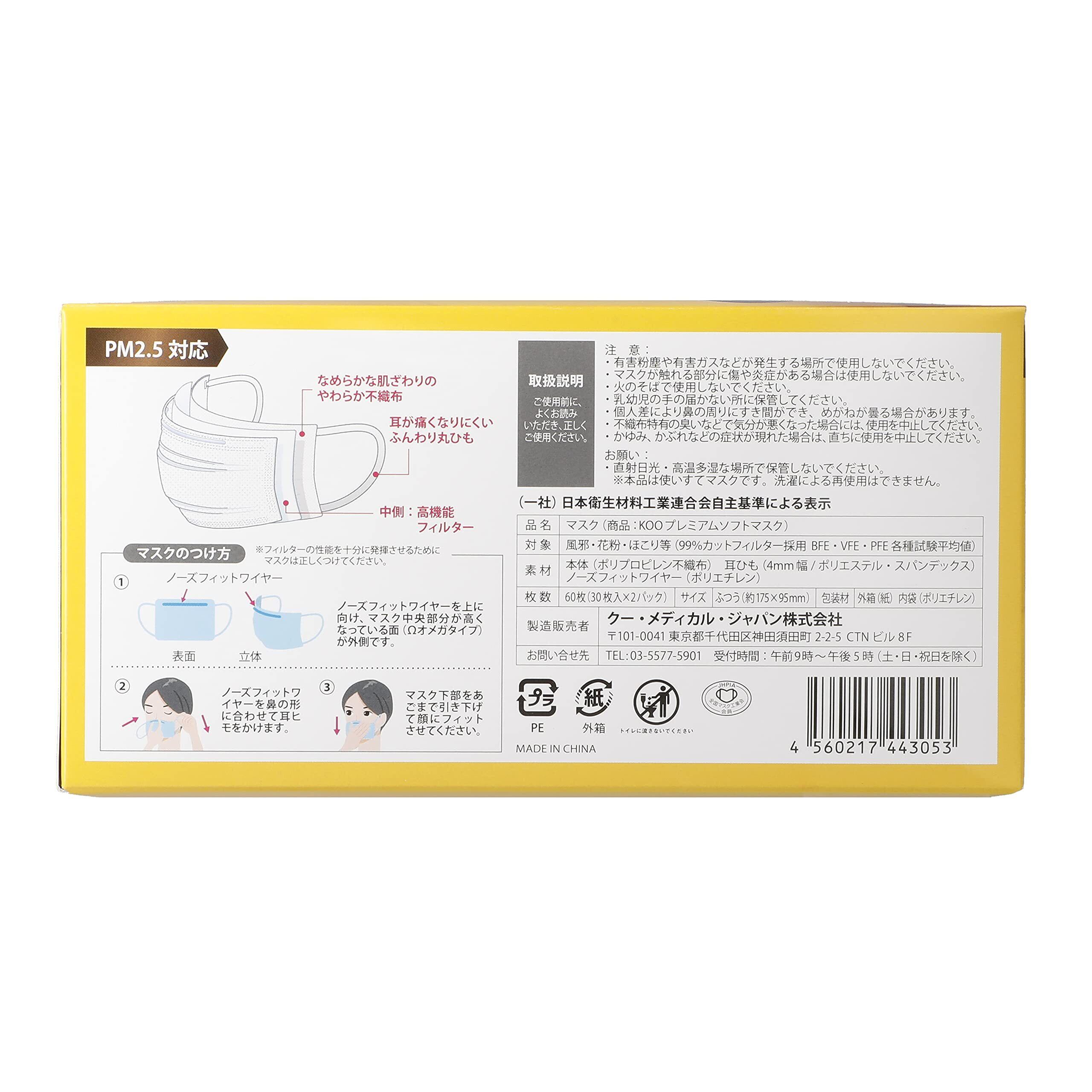 クー・メディカル・ジャパン 【全国マスク工業会会員】不織布 マスク KOO(クー)プレミアムソフトマスク ふつうサイズ 60枚入