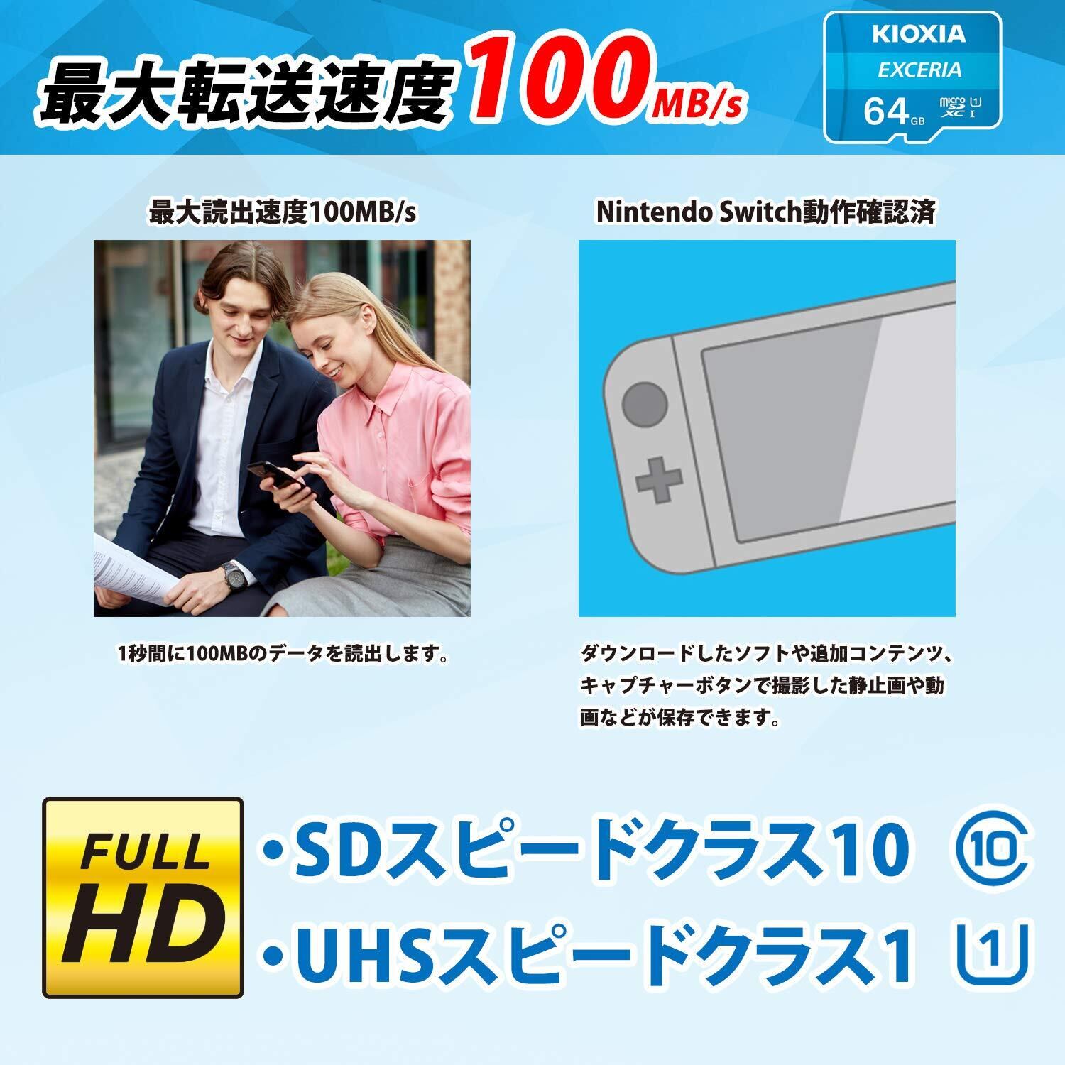 KIOXIA(キオクシア) 旧東芝メモリ microSD 64GB UHS-I Class10 (最大読出速度100MB/s) Nintendo Switch動作確認済 国内サポート正規品 メーカー5年 KLMEA064G