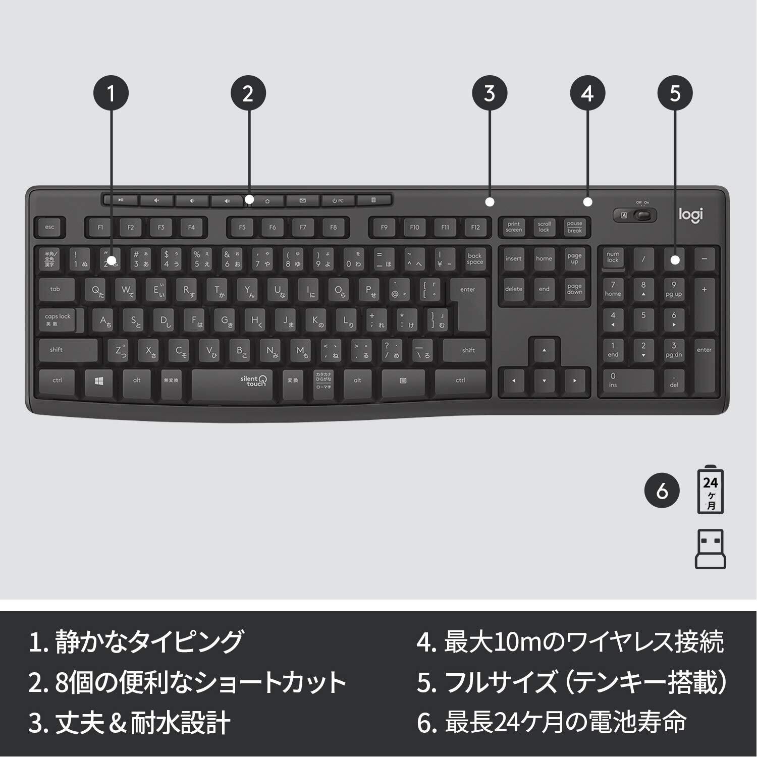従来モデルより90%の操作音を削減した静音キーボードが登場。ロジクール独自の新技術SilentTouchテクノロジーを採用したこの静音キーボードはタイピング感覚はそのままに、静かな場所でも人を気にせず作業することができます。 キーボードは8つのショートカットキーとテンキーを搭載したフルサイズの日本語配列キーボード。水をこぼしても安心な耐水設計で、キースイッチは耐久性に優れています。 裏面には8度の傾斜をつけられるスタンド付き。タイピングがしやすくなっています。 接続はUnifyingUSBレシーバーに対応。アドバンス2.4GHzワイヤレス接続で最大10mの接続範囲に対応し、混雑したワイヤレス環境でも途切れにくくなっています。 最長24ケ月の長電池寿命も魅力のキーボードです。 対応OS:Windows7以降、Chrome OS