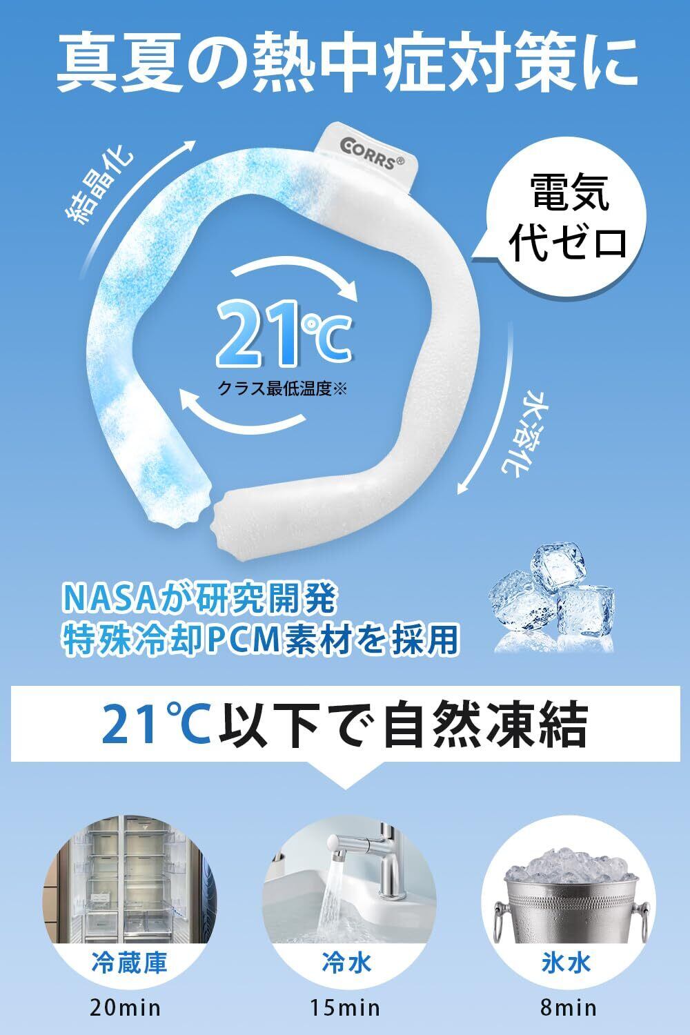 【3時間保冷&21℃以下で自然凍結】このネッククーラーは氷水に置くと10分で凍結し、冷蔵庫で30分かかります。凍結したネックリングは溶解がゆっくりと進み、30℃の環境下では約3時間温度を保ちます。冷却素材が使用されており、21℃以下になると自然に凍結し、温度をキープします。通常の氷よりも冷たくなく、低温障害の心配もなく、大人も子供も安心して使用できます。