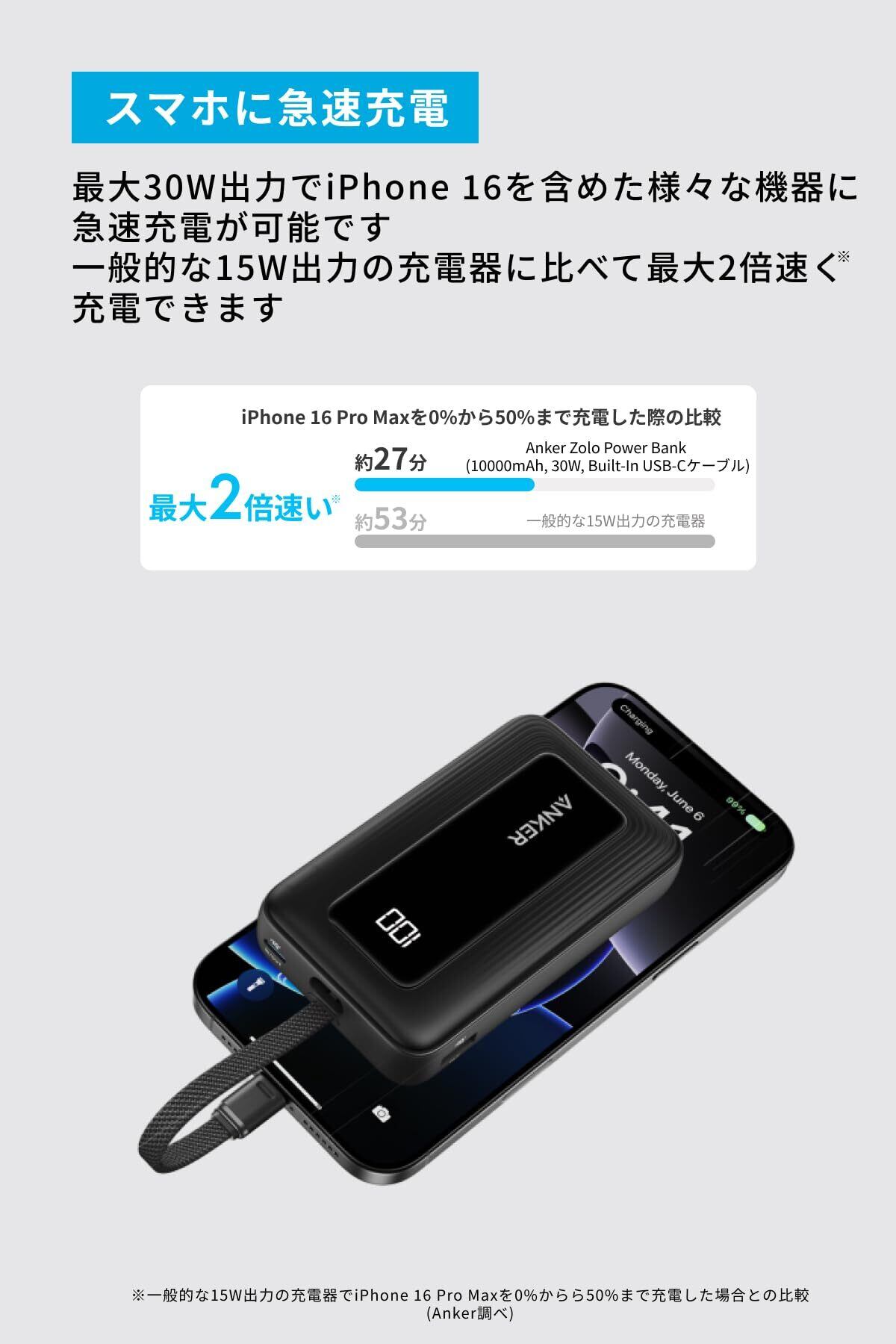 Anker Zolo Power Bank (10000mAh, 30W, Built-In USB-Cケーブル) (モバイルバッテリー 10000mAh 最大30W出力 USB-C ケーブル一体型 ディスプレイ搭載) 【PD/PowerIQ搭載/PSE技術基準適合】iPhone 16 / 15 Android iPad その他各種機器対応 (ブラック)
