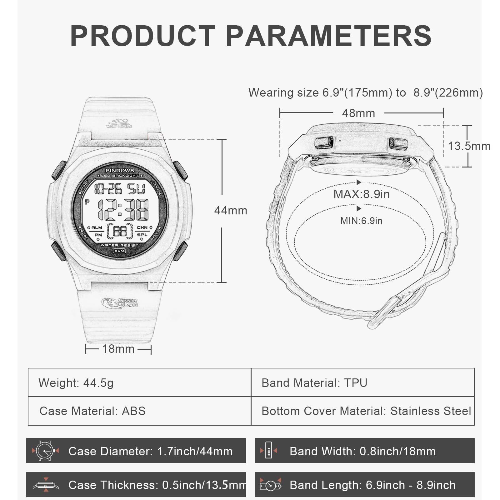 PINDOWS 女性用腕時計、デジタルスポーツウォッチ、50m防水、LEDバックライトリストウォッチ(アラーム、ストップウォッチ、カレンダー付き)、屋内外で毎日使える