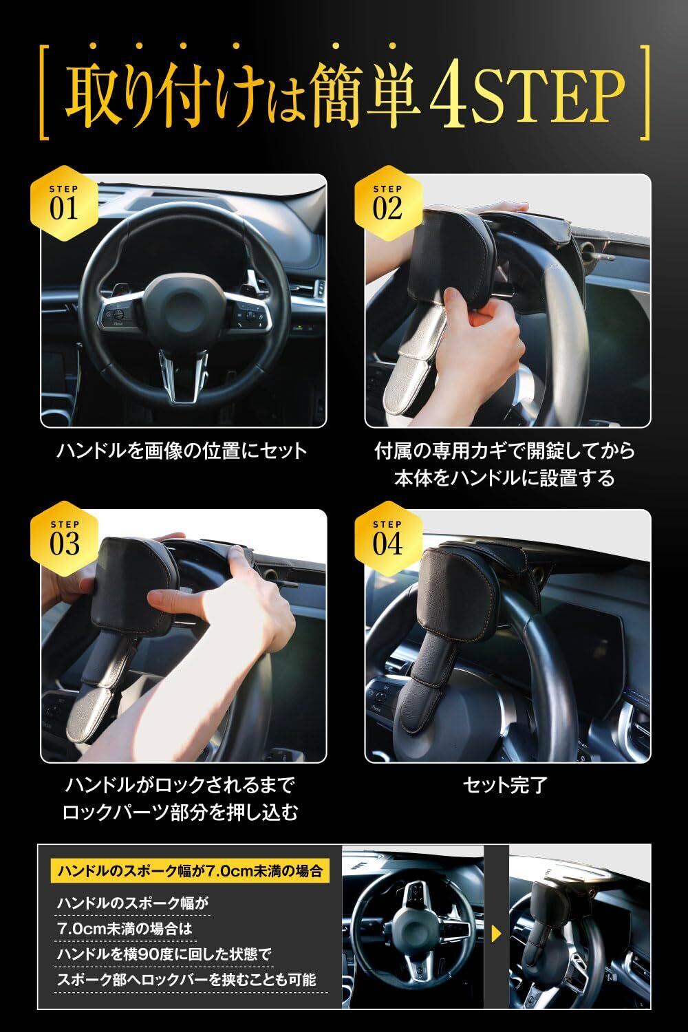 【 “堅牢シリンダー(鍵穴)構造を採用 】ピッキングやドリルなどによる破壊に強いシリンダー(鍵穴)構造を採用。ハンドルロック本体だけでなく、シリンダー破壊による盗難を防止します。【 レザー素材を使用した上質なデザイナーズ設計 】ブラック基調のデザインで車内の景観を損なわないスタイリッシュなデザインを実現。また、レザーが製品全体をカバーすることで車体を傷つけにくく、大切なお車を守ります。