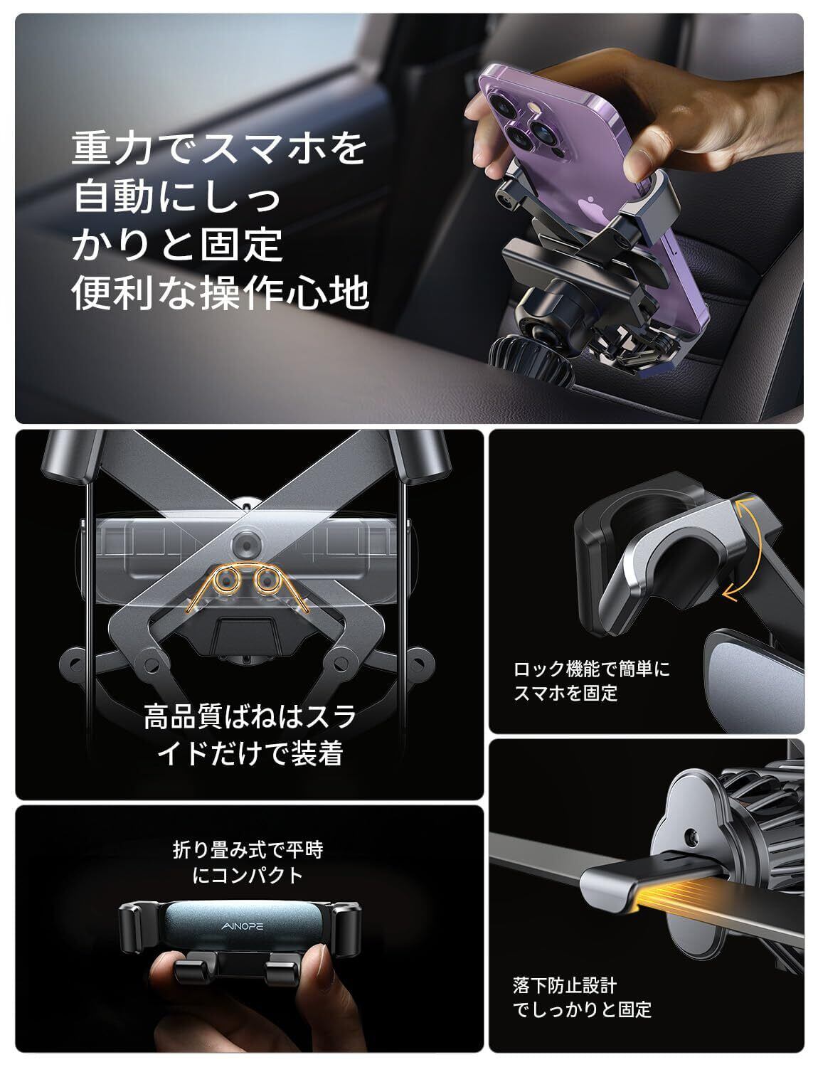 【2025最新進化クリップ&最強の安定】AINOPE スマホホルダー 車 車載ホルダー 重力式 エアコン吹き出し口 片手操作 スマホスタンド 回転可能 自由調節 手帳型ケース 車用 スタンド カー用品 iPhone 16 15 14 13 12 Pro Max Xperia Galaxy S25など4-7インチ全機種対応青灰色