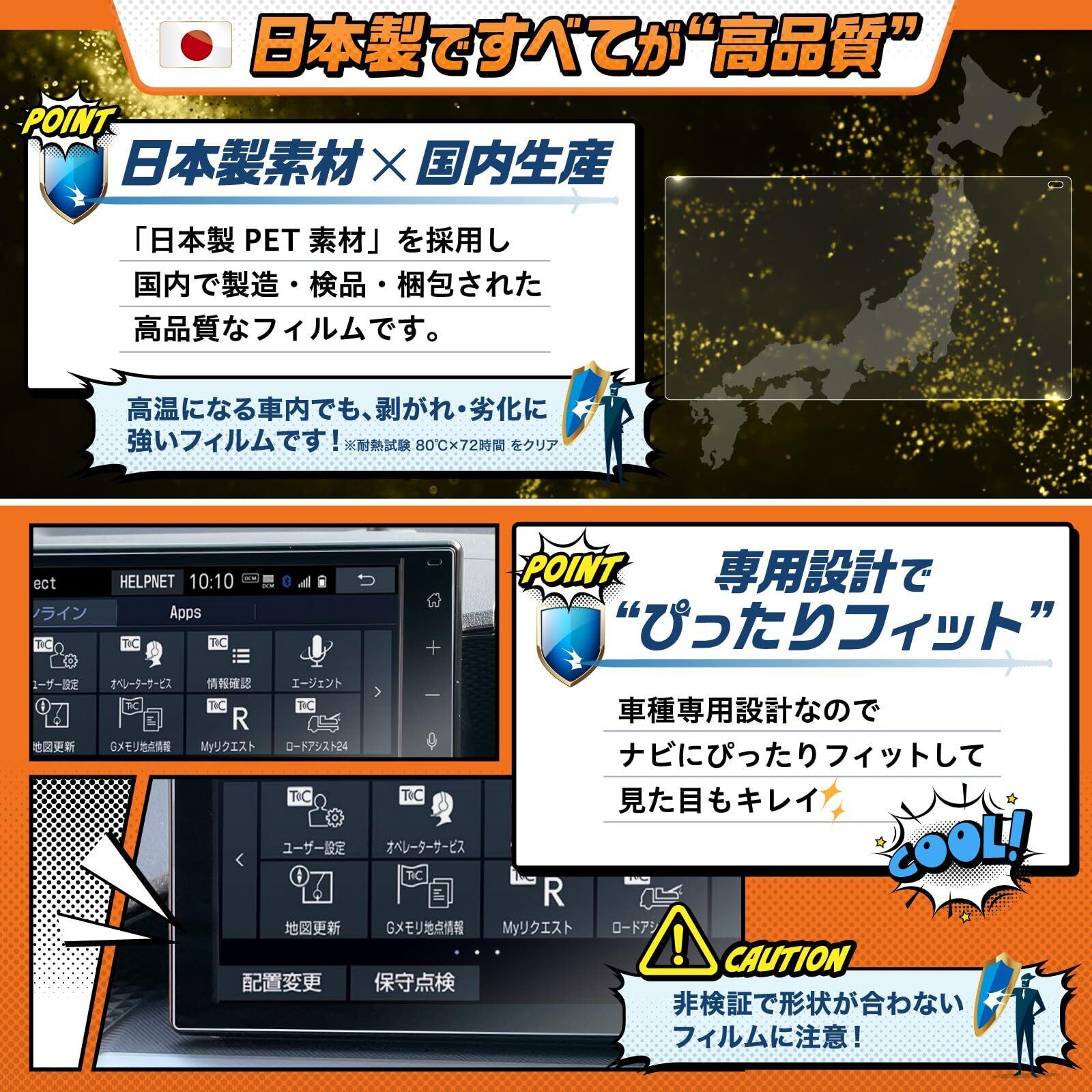 【超透明】:透過率96%の高透過フィルムなので、画面の美しさを損わず、鮮やかな画面のまま映像を楽しめます。 【低反射】反射率1.1%の低反射フィルムなので、反射や映り込みを軽減し、明るい車内でも画面が見やすくなります。 【指紋防止】:フィルム表面の特殊フッ素加工により、指紋が目立ちにくく、付着しても簡単に拭き取れます。