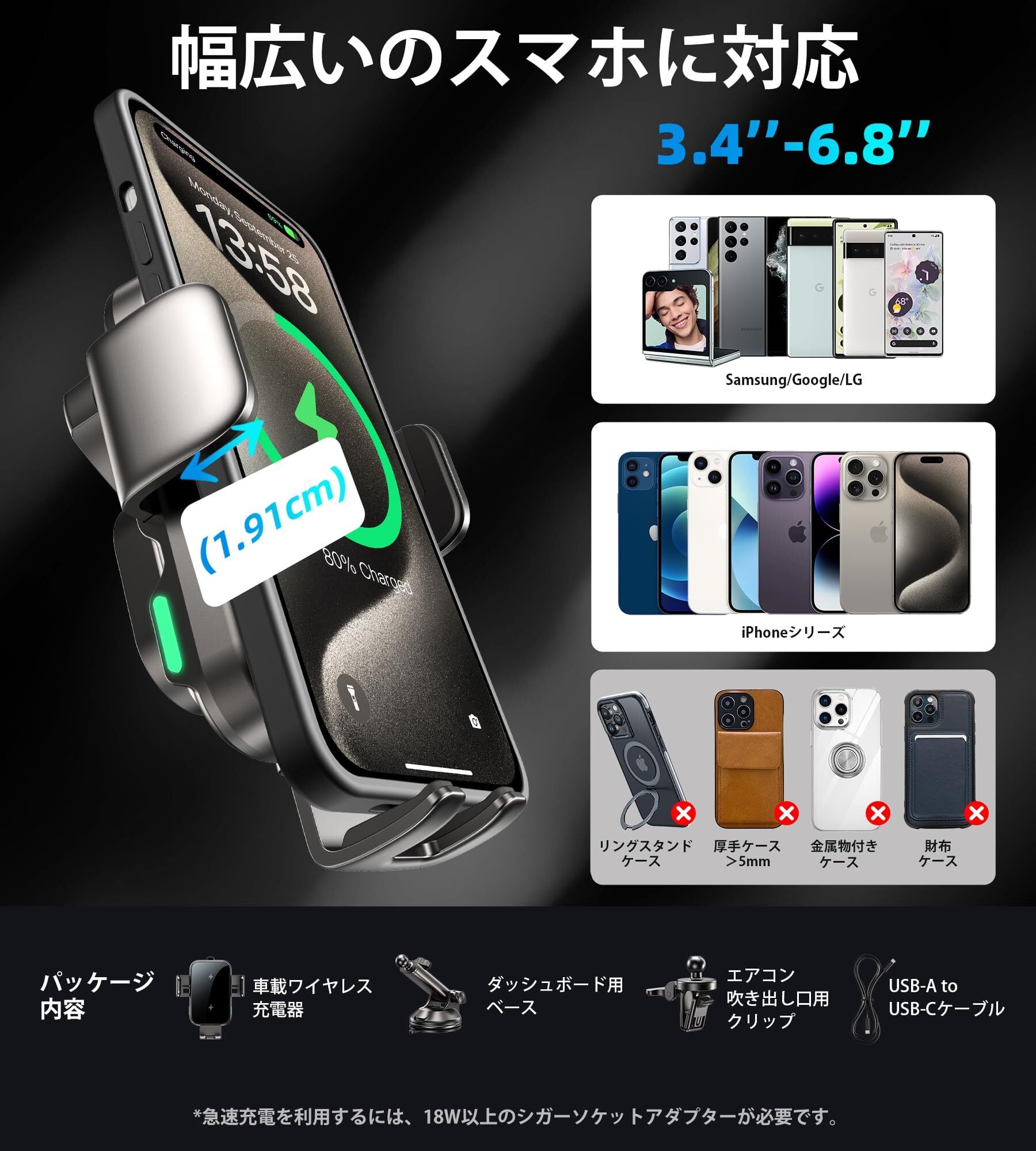【多機種対応&多重保護機能】この車載スマホホルダーは調整可能なベースを備え、3.4~6.8インチのスマートフォンに対応可能です。iPhoneシリーズ、AQUOS wishシリーズ、HUAWEIシリーズ、Samsungシリーズなど、ワイヤレス急速充電に対応する機種でお使いいただけます。また、短絡防止、過熱防止、過電流保護、過電圧保護など多重保護機能を搭載しており、安全で迅速な充電をサポートします。ご注意:スマホケースが厚すぎる場合や、金属リングが付いていると、ワイヤレス充電機能が正常に動作しない場合があります。ご注意:必ず5V/3A(15W)以上のシガーソケットポートをご使用ください。※複数ポート同時充電時、出力分散で単ポートが15W未満になることがあるので、ぜひ接続ポートの出力が15W以上を確保してください。車載USBポートは電力不足やデータ通信専用で給電非対応の場合があり、正常に給電できない場合があります。
